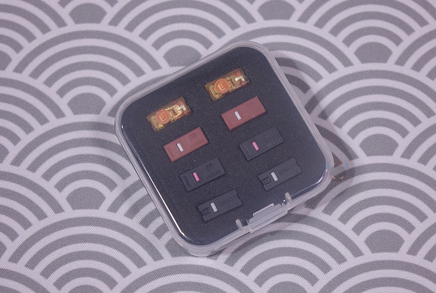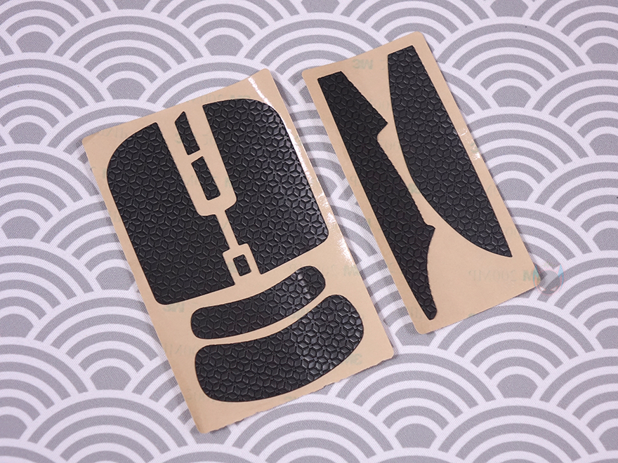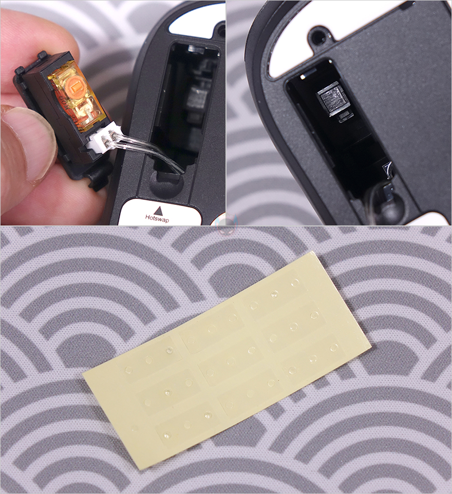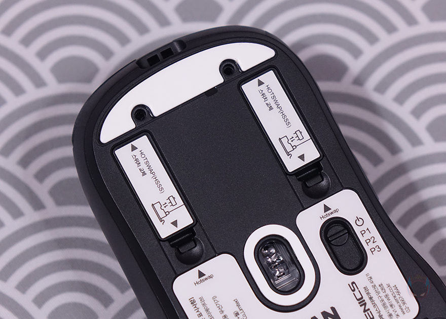 또한, 앞서 구성품에서 확인했듯이 기본 장착된 카일 스위치외에 교체할 수 있는 추가 스위치를 보관박스에 담아서 제공해주고 있는데, 박스 안에는 총 4가지 종류의 스위치가 들어있습니다. 맨 위에서부터 TTC의 골드스위치, 그 아래 후아노 저소음 스위치, 후아노 핑크 스위치, 옴론 스위치죠. 요즘 해외 브랜드 마우스 제품들에서 한 번쯤을 볼 수 있는 인기 스위치들이 들어있습니다. 스위치마다 클릭압과 소음에 차이가 있기 때문에, 제닉스에서도 상품소개에 상세하게 담고 있으니 참고하면 좋습니다. 스위치 교체는 분리한 자리에 그대로 다시 넣어주면 되는 거라 상당히 쉽고, 내부에 버튼 뎀버도 ㅁ자 디자인으로 적용해 클릭 정확성을 높였습니다. 또한, 스위치 자체의 특성이 사용자 취향에 부족할 경우 이를 보완할 수 있게 스페이서까지 제공해주고 있죠. 그리고, 커버 바깥쪽에는 피트를 추가로 붙이고 싶은 사용자를 위해 크기에 맞춘 피트를 제공해주고 있습니다.
