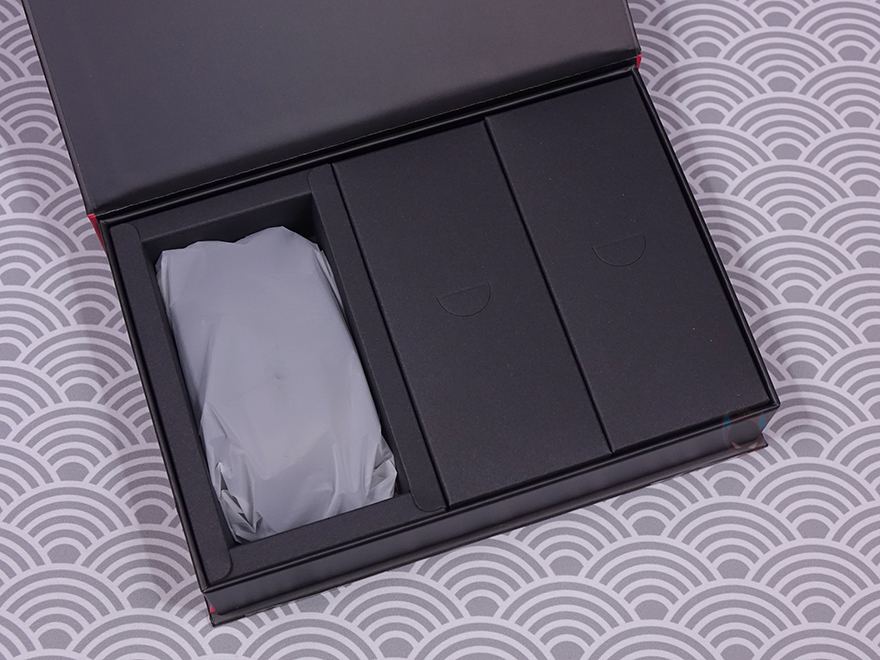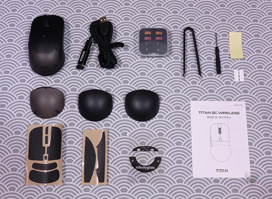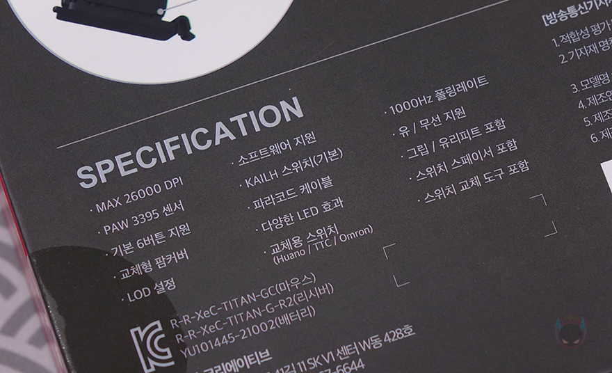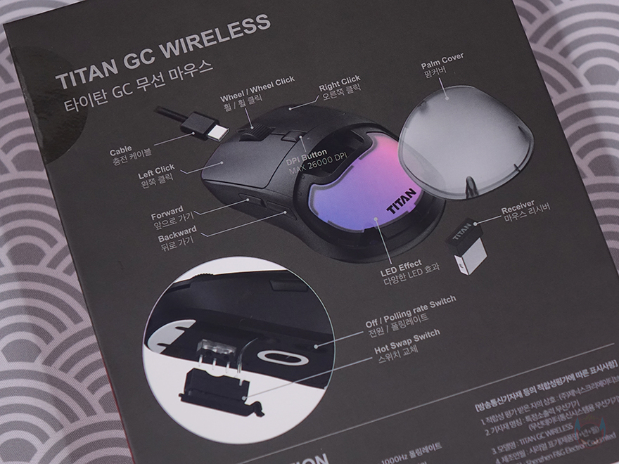 박스가 열리는 오픈부분에는 씰을 부착해 놨으며, 박스는 도어방식으로 열리는 고급 박스형태로 박스를 열어보면, 기본 비닐포장된 마우스를 비롯해 2개의 속박스를 확인할 수 있습니다. 2개의 속박스에는 각각 다양한 부속품들이 포장되어 들어있으며, 제품 구성은 타이탄 GC 무선 마우스, 전원케이블(리시버 기본연결 포함), 교체용 스위치 박스, 교체용 도구들, 스위치 스페이서, 교체용 팜커버, 각 종 피트 및 그립, 제품설명서로 이루어져 있습니다. 참고로 타이탄 GC 무선 마우스의 무상 보증기간은 1년입니다.