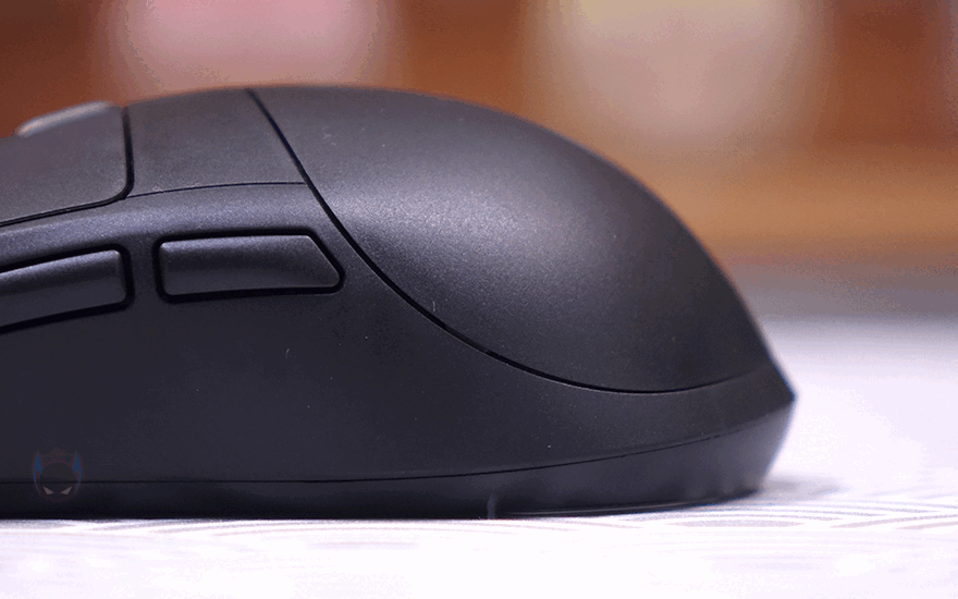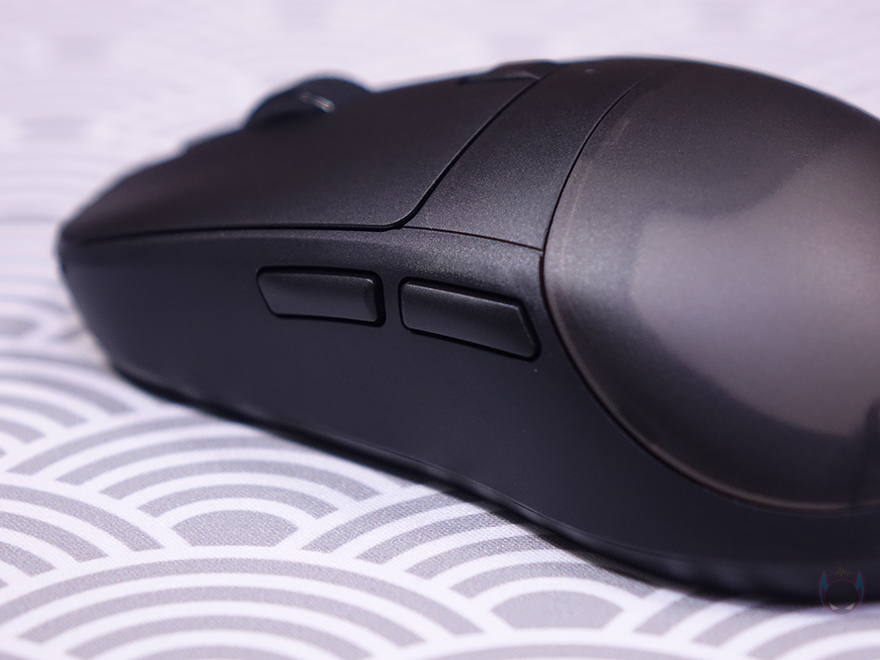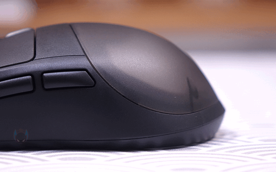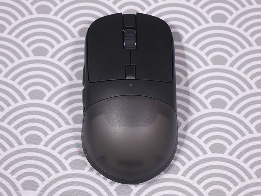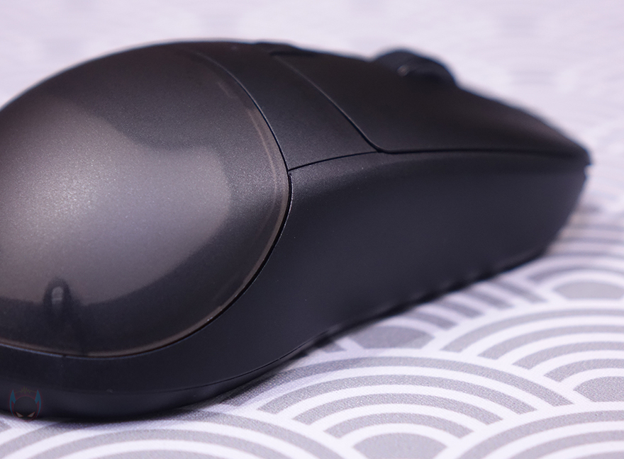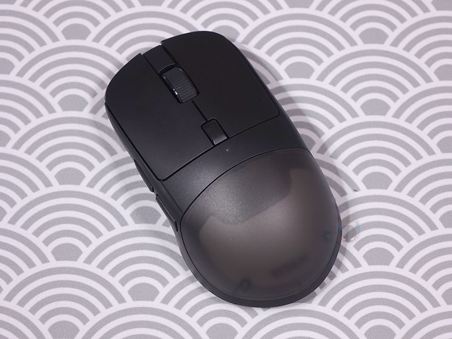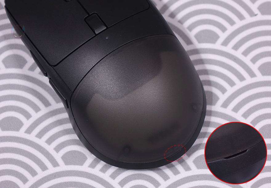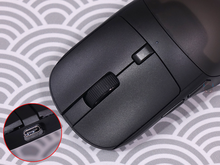 좀 더 자세히 살펴보면, 기본 좌우 버튼은 좌우 커버 영역이 분리 설계된 디자인으로 그립형태에 상관없이 클릭이 잘 되도록 유도했으며, 편안한 그립감을 위해 손가락형태에 맞춘 약간 안으로 굴곡진 인체공학적 디자인을 적용하고 있습니다. 그리고, 가운데 휠-버튼은 고무재질 마감처리와 함께 돌기 디자인을 적용해 접지력이 높도록 했으며, 휠-버튼 뒤로는 DPI 버튼이 배치되어 있으며, 그 뒤에는 DPI 단계상태를 모니터링 할 수 있고, 무선 마우스이기 때문에 배터리 상태를 확인할 수 있는 LED 인디케이터를 적용해 놨습니다. 또한, 전면에는 제공되는 분리형 전원케이블과 연결되는 USB 타입 C 포트가 적용되어 있죠. 손바닥과 맞닿는 팜레스트 부분은 후면에 작은 홈을 통해 커버를 분리할 수 있게 해 놨는데, 자석방식으로 손쉽게 탈부착할 수 있습니다.