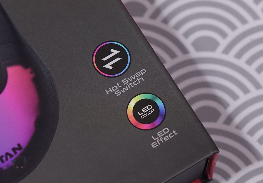 제품 박스부터 살펴보면, 전면에 제품 이미지를 담고 있어서 미리 마우스 디자인을 간접적으로 확인할 수 있으며, 모델명도 큼지막하게 새겨놨죠. 또한, 색상 표기와 주요 특징으로 핫-스왑 스위치, LED 효과를 표기해놨는데, 핫-스왑 스위치는 박스 후면에서 좀 더 쉽게 바로 이해할 수 있게 이미지를 담고 있습니다. 박스 후면에 제품 풀샷 이미지와 함께 제품 주요 명칭들을 다 표기해 놨으며, 마우스 스위치 교체방식 이미지도 담고 있죠. 물론, 후면 아래에 제품의 기본 사양도 표기를 해놨습니다.