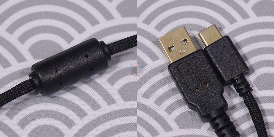 밑바닥 가운데는 내부 센서 위치로 내부에는 앞서 제품박스 사양표기에서 확인했듯이 PixArt사의 PAW3395 광센서가 내장되어 있는데, 현재 무선 게이밍 마우스 하이엔드 제품들에서 많이 볼 수 있는 하이엔드 센서 중 하나입니다. 그리고, 바로 오른쪽에는 무선 On/Off 겸 전송제어속도 스위치가 적용되어 있는데, 전원 표시부분이 Off이고, P1부터 On이 되면서 500Hz, P2는 1,000Hz, P3는 125Hz로 설정됩니다. 또한, 밑바닥 부분에 부드러운 움직임을 위해 기본 부착된 피트 외에 좀 더 빠른 움직임을 원한다면, 구성품에서 확인한 실리케이트 재료의 유리피트를 추가로 사용하면 됩니다. 끝으로, 분리형 전원케이블은 개봉 시 무선시 사용되는 리시버와 리시버 젠더가 함께 연결되어 있으며, 분리도 가능하죠. 전원케이블은 꼬임방지를 위한 파라코드 케이블이며, 신호손실 최소화를 위해 노이즈 필터가 적용되어 있고, USB 인터페이스는 Type-A to C로 역시 신호손실 최소화를 위해 금도금처리되어 있습니다. 그리고, 앞서 팜레스트 내부에서 잠깐 언급했듯이 무선시 사용되는 리시버는 사용하지 않을 시 팜레스트 내부 수납공간에 수납하면 됩니다.