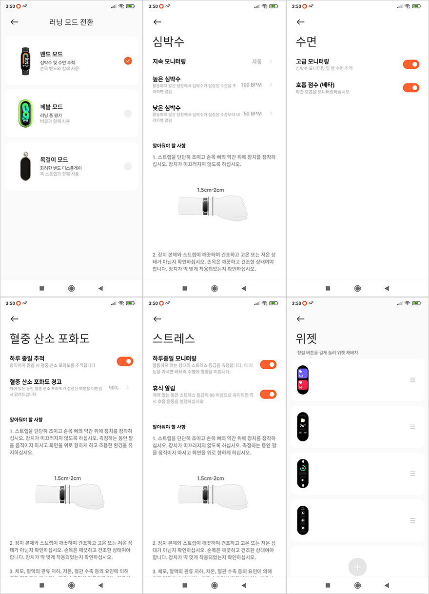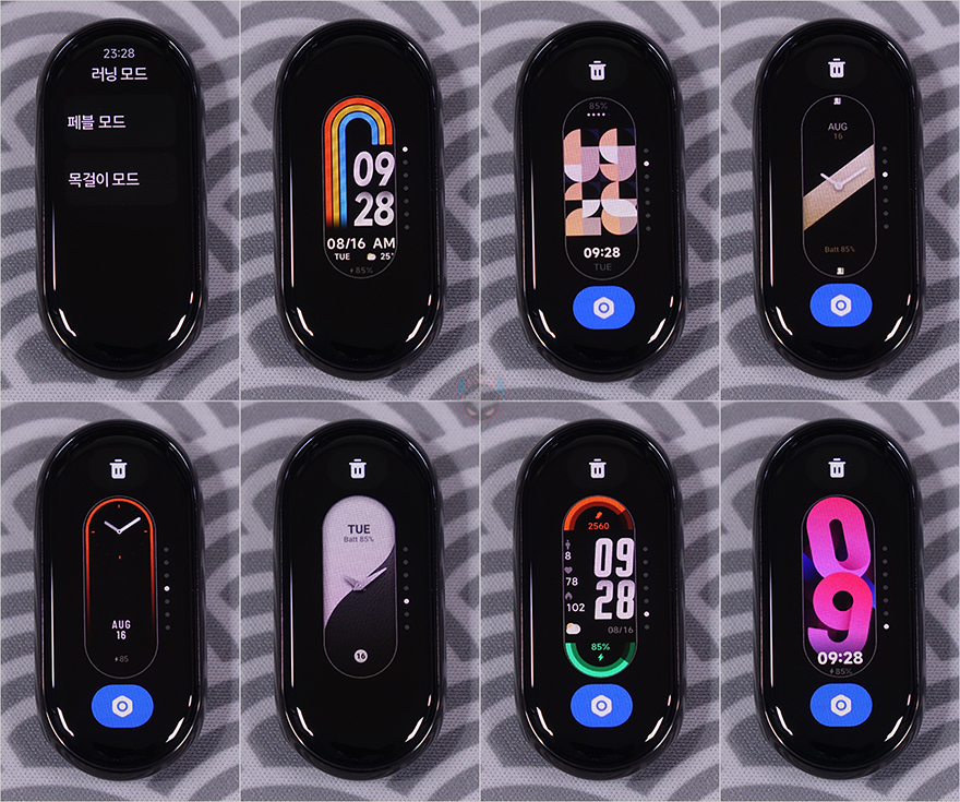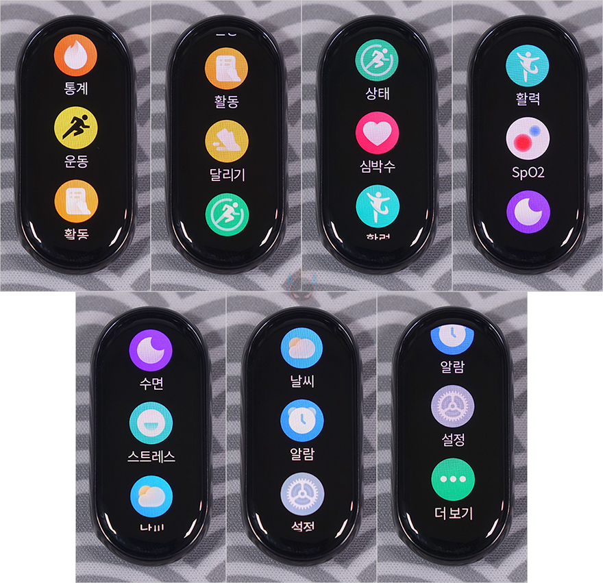미밴드8 화면을 살펴보면, 앞서 언급했듯이 화면 크기는 1.62인치로 이전 세대와 동일하며, 해상도와 픽셀밀도 역시 192x490, 326 PPI로 동일합니다. 물론, 업그레이드된 부분도 있는데, 바로 최대밝기로 이전 7세대에선 500 니트(nit)였지만, 8세대는 100 니트 높아진 최대 600 니트 밝기를 가졌습니다. 또한, 화면주사율도 최근 샤오미의 스마트워치 제품들처럼 60Hz를 갖춰서 화면 움직임이 더 부드러워졌습니다. 그래서, 화면 메뉴를 살펴보면, 옆으로 슬라이드 했을 때 메뉴는 수면과 심박수, 날씨, 재생, 퀵 메뉴가 나오는데, 퀵-메뉴-설정으로 들어가면 총 12개의 설정메뉴를 확인할 수 있고, 첫 번째인 러닝모드에는 앞서 스트랩에서 언급했던 목걸이용과 신발에 사용했을 때 사용할 수 있는 2가지 모드를 확인할 수 있습니다. 그리고, 밴드 디스플레이를 통해서는 기본 7가지 워치페이스를 탑재하고 있는것을 확인할 수 있죠. 물론, 옆으로 넘겼을 때 나오는 메뉴들은 위젯 방식이라 미-피트니스 어플을 통해서 위젯을 사용자취향으로 추가/변경할 수 있습니다.