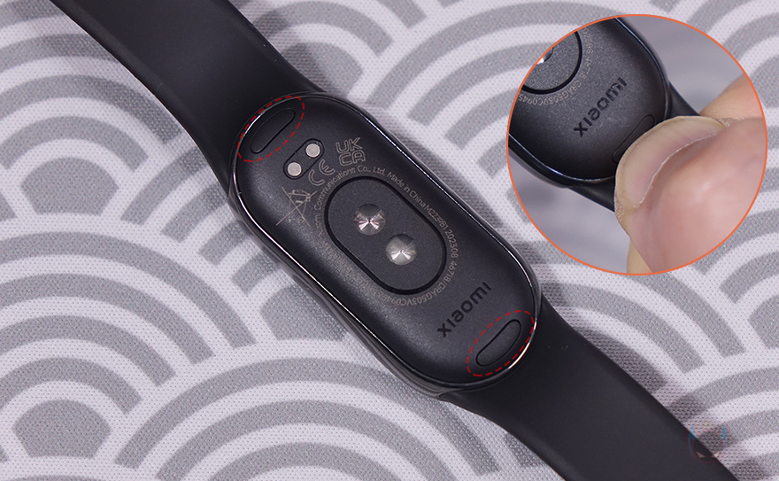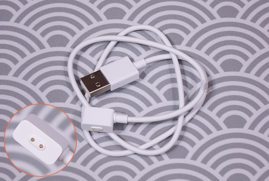기본 스트랩은 이전 세대와 마찬가지로 이번에도 TPU 재질의 스트랩이 사용되었으며, 착용방식도 동일합니다. 착용조절을 할 수 있게 총 13개의 구멍이 있죠. 그리고, 밴드 화면 후면을 보면, 가운데 센서 부분과 그 위에 충전케이블과 접촉하는 접지, 그리고, 위아래 스트랩을 분리할 수 있는 버튼이 있습니다. 이번 미밴드 8은 앞서 언급했듯이 스트랩에도 변화가 생겼는데 바로 연결부분으로 이전 세대까지 제품들은 스트랩에 밴드 화면을 끼우는 방식으로 분리/장착 그러니깐 스트랩이 통짜로 분리되었는데, 이번 미밴드8은 스마트워치 스트랩처럼 위아래가 따로 분리/장착되는 방식입니다. 그래서, 마치 시계처럼 좀 더 다양한 스트랩 제품들을 사용할 수 있고, 목걸이처럼 펜던트(Pendent)로 사용할 수 있는 액세서리나 신발에 장착할 수 있게 러닝 클립 액세서리를 출시해 활용도가 넓어졌습니다. 물론, 액세서리들은 별도로 구매해야 합니다. 그리고, 충전케이블도 역시 이전 세대들과 다른 디자인으로 바뀌었고, 길이는 약 50cm입니다.