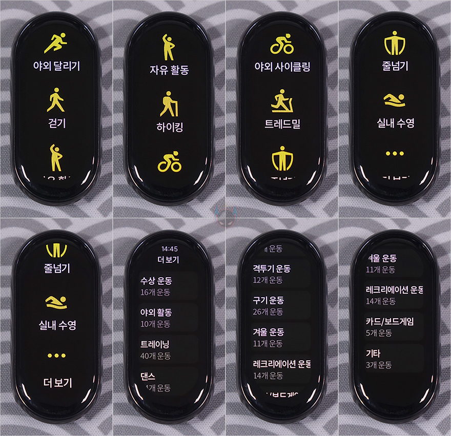 이번엔 화면을 위로 슬라이드 했을때 나오는 메인 메뉴들을 살펴보는데, 활동량을 확인할 수 있는 통계를 비롯해, 운동/활동/달리기/상태/심박스/활력/SpO2(혈액산소포화도)/수면/스트레스/날씨/알람/설정/더보기를 첫 번째로 확인할 수 있습니다. 그리고, 더보기를 누르면 좀 더 메뉴를 확장해서 보여주는데, 일정/알림/호흡/스톱워치/음악/휴대전화찾기/세계시계/휴대전화무음/카메라/타이머/손전등/포커스 메뉴를 추가로 확인할 수 있죠. 대부분 이전 세대에서도 볼 수 있던 메뉴들이 있으며, 운동모드 같은 경우에는 야외달리기/걷기/자유활동/하이킹/야외 사이클링/트렌드밀/줄넘기/실내수영 8가지 기본 메뉴 외에 더보기로 들어가면, 세부적으로 다양한 운동들을 추가로 확인할 수 있는데, 트레이닝이 40가지로 가장 많고, 그다음 구기 운동, 수상 운동 등으로 총 150가지 운동 모드를 갖추고 있습니다. 참고로, 이전 7세대는 110가지 운동모드였습니다.