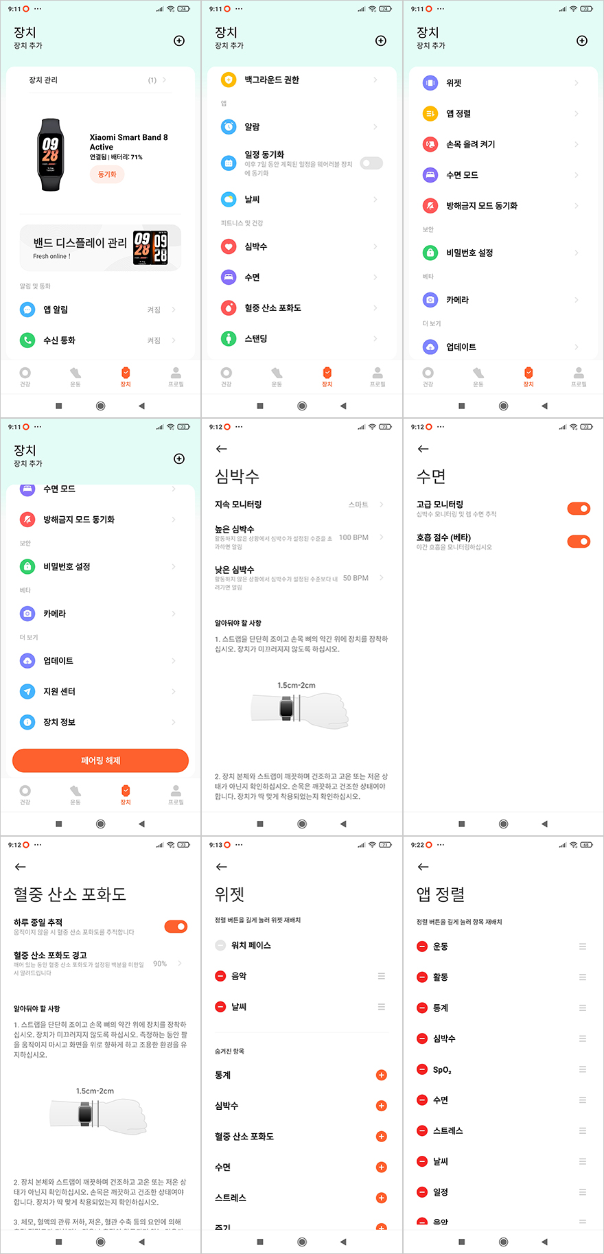 장치 메뉴는 미밴드8 액티브 기기에 담긴 기본 메뉴 기능들의 설정을 어플에서 좀 더 세밀하게 설정할 수 있는데, 미밴드8 액티브가 미밴드8 시리즈 중 가장 저렴한 모델이지만, 심박수나 수면, 혈중 산소포화도(SpO2) 같은 설정은 상위 모델들과 동일하게 실시간 및 하루종일 모니터링할 수 있게 설정할 수 있습니다. 그리고, 앞서 언급했던 기기에서 볼 수 있는 퀵-메뉴 역시 어플에서 추가로 메뉴를 추가할 수 있으며, 기기에서 볼 수 있는 기본 메뉴 순서도 어플에서 변경할 수 있습니다. 또한, 워치페이스 역시 밴드디스플레이 관리로 들어가면 더 다양한 워치페이스들 볼 수 있는데, 총 12개의 카테고리로 분류되고 있으며, 100개이상의 디자인을 제공해주고 있어서 사용자 취향에 맞게 밴드에 저장된 기본 워치페이스 외에 3개를 더 적용할 수 있습니다.