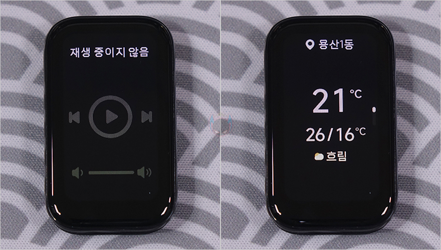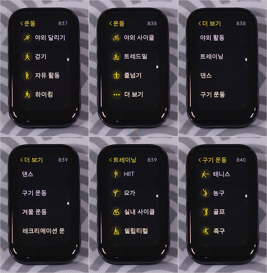 미밴드8 액티브 화면에 나오는 메뉴들을 살펴보면, 옆으로 슬라이드 했을 때 나오는 퀵-메뉴는 음악과 날씨뿐입니다. 물론, 이건 개봉 시 기본 설정이고, 뒤에서 다시 확인하겠지만, 샤오미 웨어러블 어플 미-피트니스(Mi Fitness)를 통해서 추가로 사용자가 취향대로 위젯을 추가시킬 수 있습니다. 그리고, 위로 슬라이드 했을 때 나오는 기본 메뉴에는 '운동/활동/통계/심박수/SpO2(혈중산소포화도)/수면/스트레스/날씨/일정/음악/카메라/알람/스톱워치/타이머/휴대전화 찾기/설정'입니다.