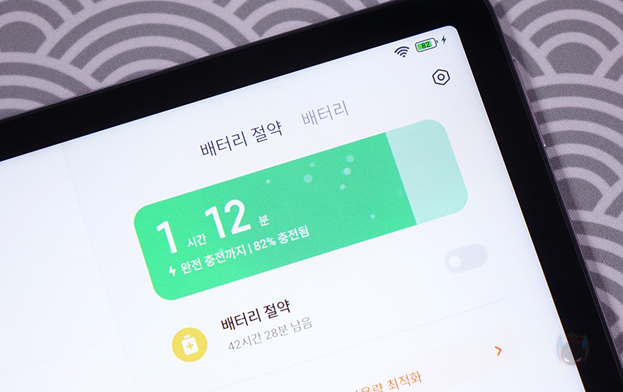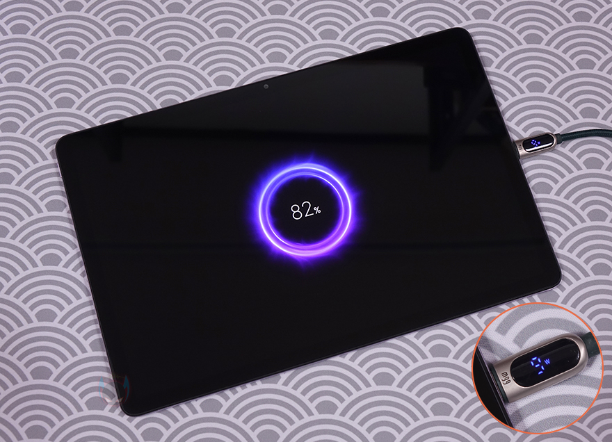 끝으로, 샤오미 레드미 패드 SE 태블릿 PC의 충전은 앞서 충전어댑터에서 언급했듯이 최대 10W 충전속도를 지원합니다. 이는 5년전 미패드4 플러스때와도 같은 충전속도죠. 저가형 고가형 구분없이 요즘 태블릿PC의 대부분 제품들이 18W이상의 고속충전을 갖추고 나오는경우가 많기때문에, 이부분은 꽤나 아쉬운 부분입니다. 실제로 9~10W 충전속도로 배터리 약 20%를 충전하는데 1시간 좀 넘게 소요되니깐요. 최소 18W까지 충전지원을 해줬으면 좋지 않았을까 생각이 듭니다.