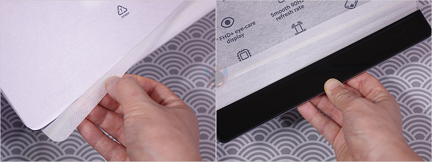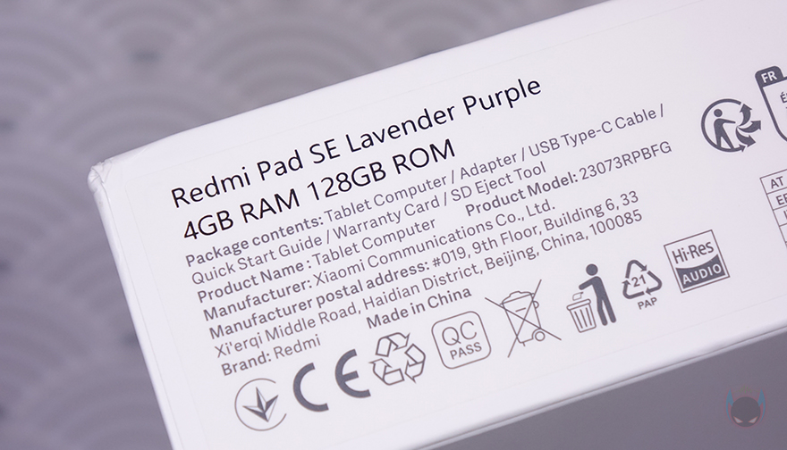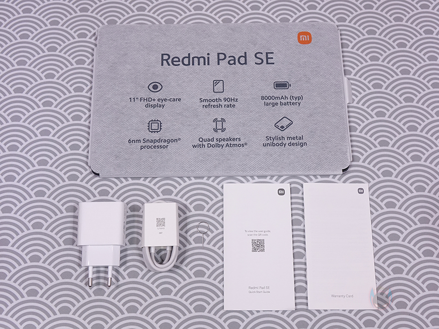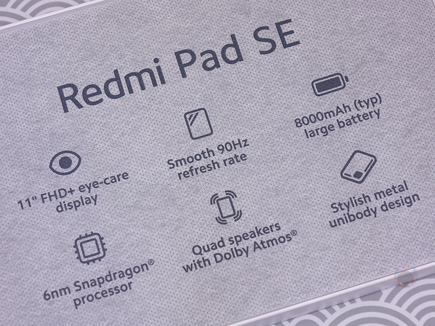 박스에는 씰(seal)이 부착되어 있기때문에 씰을 제거하고 박스를 열어보면, 레드미 패드 SE(Redmi Pad SE) 태블릿 PC는 부직포 같은 포장재에 포장된 것을 바로 확인할 수 있으며, 포장재에도 방금 언급했던 주요 특징 외에 추가로 메탈 유니바디 디자인 표기를 확인할 수 있습니다. 그리고, 태블릿 PC 포장 아래공간에는 나머지 구성품들이 수납되어 있죠. 제품 구성은 레드미 패드 SE 태블릿 PC, 충전어댑터, 충전케이블, 카드슬롯 핀, 제품설명서, 보증서로 이루어져 있습니다.