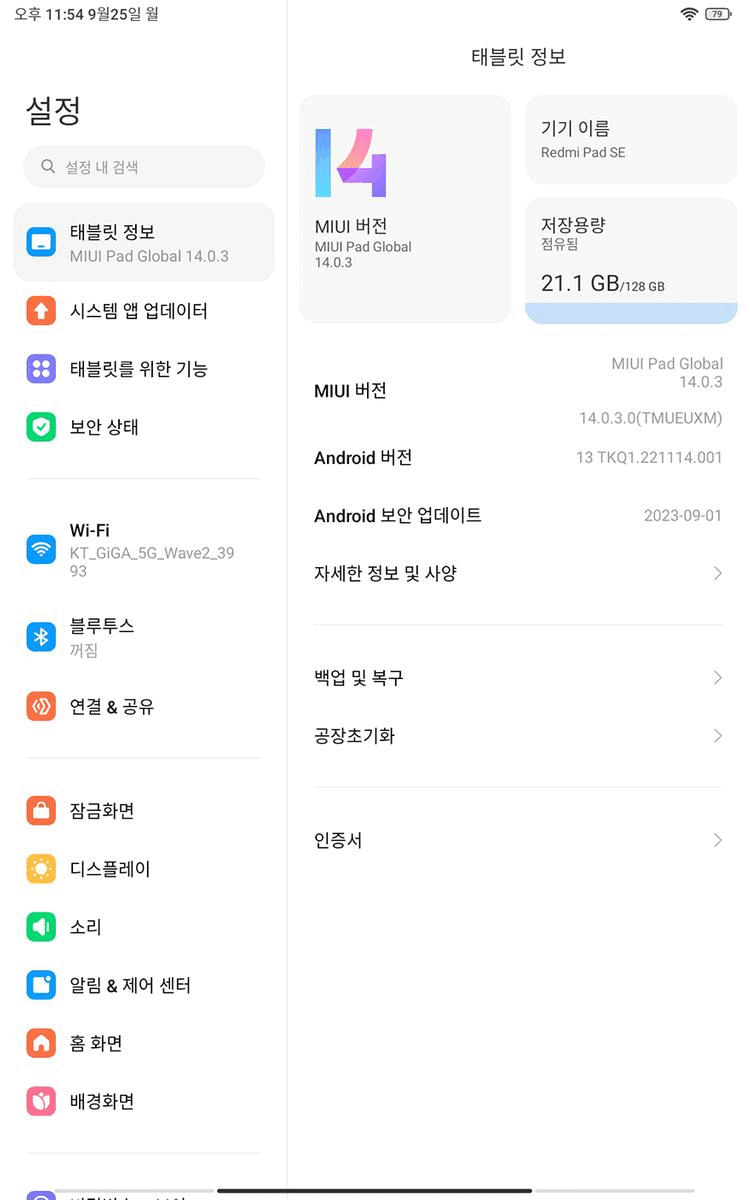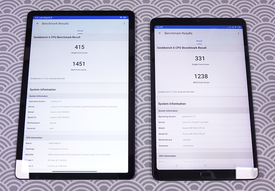 직접, 샤오미 레드미 패드 SE(Redmi Pad SE) 태블릿PC를 사용해 보면, 처음 사용할 때는 전원을 켜서 안내에 따라 기본 설정을 진행해야 합니다. 글로벌버전으로 출시되었기 때문에 당연히 한국어가 기본 포함되어 있어서 진행에 어려움은 없습니다. 그리고, 인터페이스는 안드로이드 13 버전 기반의 샤오미 태블릿 PC 전용 UI인 MIUI 14 Pad로 적용되어 있죠. 앞서 비교했던 가장 비슷한 사양의 미패드 4 플러스와 비교해 봐도 레드미 패드 SE는 지문인식 같은 장치가 없어졌기 때문에 화면 베젤차이도 확연하게 납니다. 참고로, 화면 해상도는 동일하게 1200x1920(FHD+)입니다.