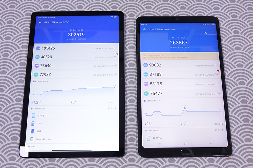 앞서 설정메뉴에서 확인했듯이, 레드미 패드 SE 태블릿PC에 적용된 APU는 퀄컴 스냅드래곤 680입니다. 앞에서 비교대상으로 여러 번 언급했던 미패드 4 플러스에 들어간 APU가 스냅드래곤 660이죠. 그리고, 메모리 사양도 4GB죠. 그래서, 두 모델의 성능을 Geekbench6와 Antutu Benchmark 10으로 확인해 보면, 레드미 패드 SE가 좀 더 앞서는 것을 확인할 수 있습니다. 실제로 스냅드래곤 680은 6 나노, 스냅드래곤 660은 14 나노로 공정에서 차이가 나지만, CPU 클럭에서도 스냅드래곤 680이 좀 더 높으며, GPU와 메모리 대역폭도 스냅드래곤 680이 더 높기 때문에 성능에서 좀 더 앞서는 결과는 당연한 거라 할 수 있죠. 물론, 스냅드래곤 660이 5년 프로세서라는 점에 스냅드래곤 680 크게 앞서는 성능은 아니기 때문에 레드미 패드 SE를 게임용으로 생각하면 안 됩니다. 2D나 아케이드 같은 비교적 사양이 낮은 게임정도 즐길 수 있는 거죠. 실제로 사양이 좀 되는 3D게임을 실행해 보면 자동으로 게임 화질 및 그래픽 설정이 낮음으로 적용되는 것을 확인할 수 있습니다.