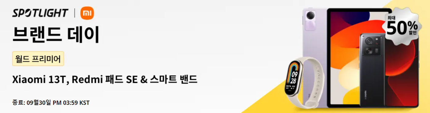 어제 샤오미(Xiaomi)가 한국시간 기준으로 오후 9시 하반기 첫 신제품 발표회를 가지면서, 글로벌 쇼핑몰 알리익스프레스(www.aliexpress.com)에서도 출시기념에 맞춰서 샤오미 브랜드 데이 할인행사를 시작했다. 이번 할인행사는 9월 30일까지 진행되며, 행사 제품에는 샤오미 13T 시리즈 스마트폰, 레드미 패드 SE 태블릿PC, 스마트밴드인 미밴드8과 미밴드8 액티브 상품이다. 이번 샤오미 브랜드 데이 할인행사에는 할인코드과 경품 증정으로 진행되는 할인코드와 혜택에 대한 정리는 아래와 같다.
