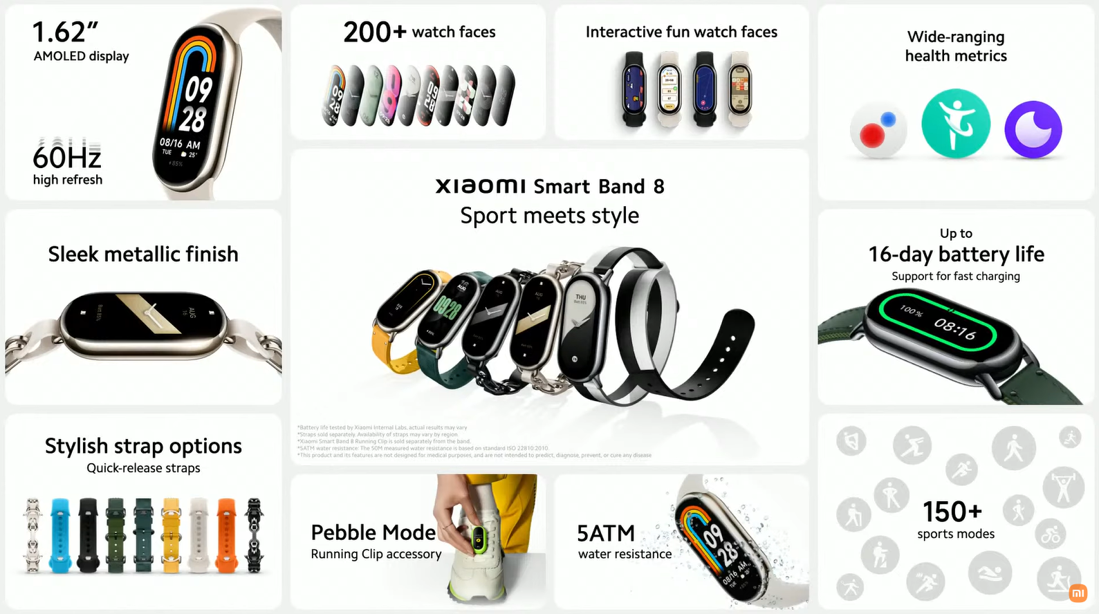 샤오미하면 스마트밴드를 떠올릴만큼 상징적인 샤오미 미밴드의 8번째 모델 미밴드8은 이전 세대와 동일한 1.62인치 아몰레드 디스플레이를 유지하지만, 60Hz 주사율을 적용해 더 부드러운 화면 움직임을 볼 수 있게되었으며, 200가지이상의 워치페이스와 150가지이상의 운동모드 외에 새롭게 스트랩 연결방식이 바뀌면서 기본 손목 스트랩 외에도 목걸이 펜던트, 신발에 착용할 수 있는 런닝 클립 액세서리를 함께 선보였다. 배터리는 최대 16일 사용가능하며, 역시 출시 날짜에 맞춰 피스커뮤에도 리뷰(https://piscomu.com/4386)를 했으며, 할인행사에는 6달러 할인코드가 제공된다.