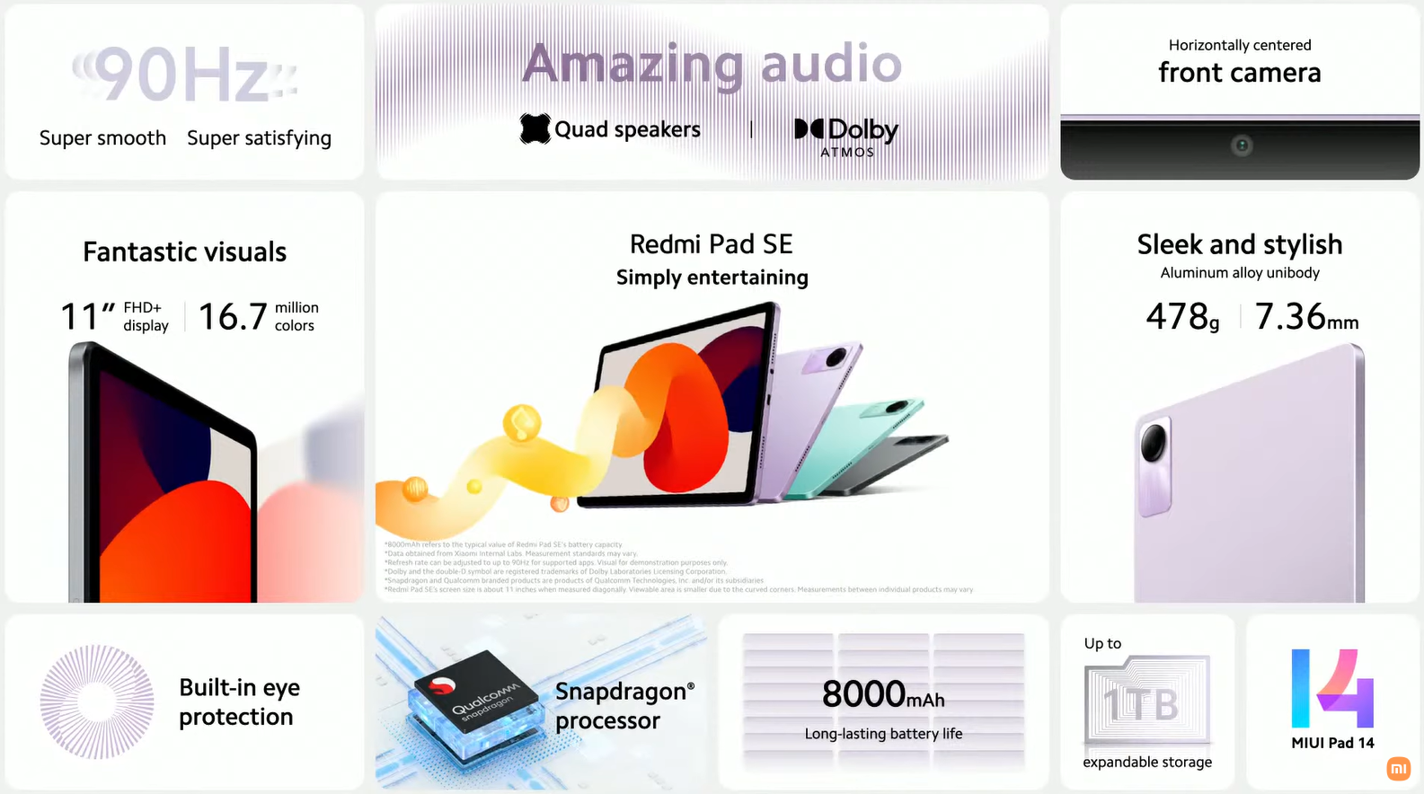 레드미(Redmi) 라인업으로 2번째 선보이는 태블릿PC 레드미 패드 SE는 먼저 나왔던 레드미 패드보다 화면이 더 큰 11인치 크기에 90Hz 화면주사율을 갖추면서, 4개의 쿼드 스피커는 돌비애트모스를 지원한다. 또한, 무게는 478g으로 가볍고, TF카드 용량확장은 최대 1TB까지 지원하며, 배터리용량은 8,000mAh에, 샤오미 태블릿PC 전용 UI인 MIUI 14 Pad가 적용되었다. 레드미 패드 SE 태블릿PC 역시 옵션 용량에 따라 20달러와 40달러 할인코드를 제공해주고 있으며, 피스커뮤에서도 출시날짜에 맞춰 리뷰(https://piscomu.com/4388)를 게시했으니 참고하면 좋겠다.