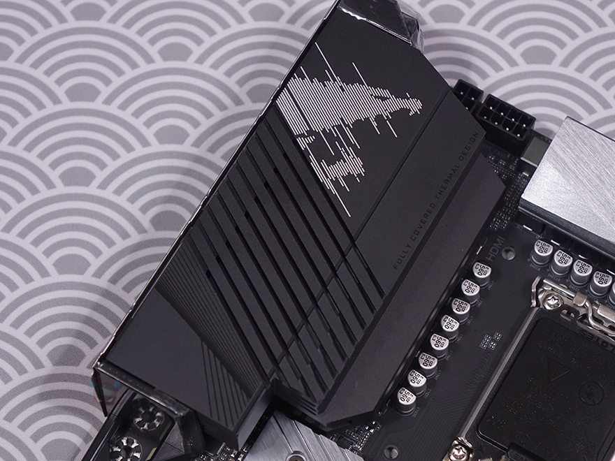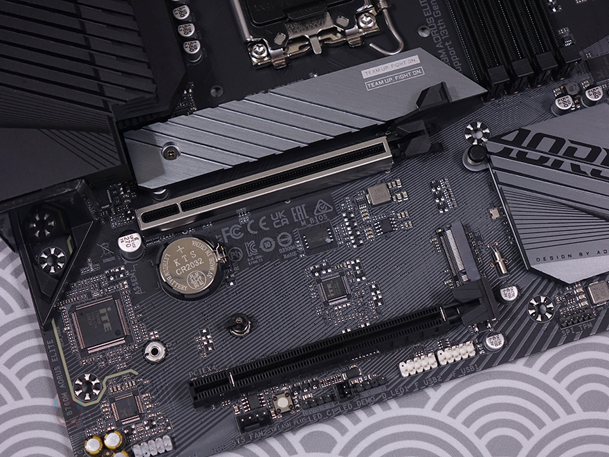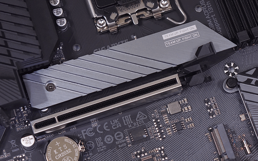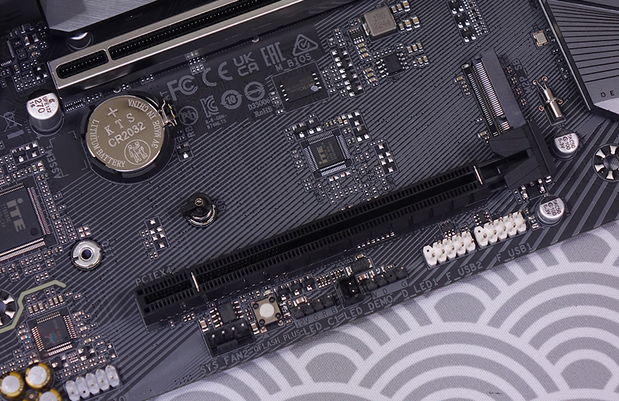 PCIe 슬롯은 총 2개 구성으로 1번 슬롯은 그래픽카드가 장착되기 때문에 내구성 강화로 스틸 아머 디자인을 적용해 놨으며, 바로 위에는 M.2 SSD 슬롯 1번 자리로 역시 방열판이 장착되어 있는데, 안쪽에 써멀패드가 기본 부착되어 있으며, SSD 규격은 PCIe 4.0에 2280 길이만 장착할 수 있습니다. 그리고, 2번 PCIe 슬롯 위치 부분에도 바로 위에 M.2 SSD 2번 슬롯이 배치되어 있으며, 규격은 동일하게 PCIe 4.0이고, 무나사로 설치할 수 있는 EZ-Latch Plus를 2280 위치에 적용했습니다. 참고로, M.2 SSD 2번 슬롯은 22110 길이까지 장착할 수 있습니다. 그리고, PCIe 2번 슬롯 아래에는 팬 커넥터와 함께 추가 5V ARGB와 12V RGB 헤더가 배치되어 있죠.