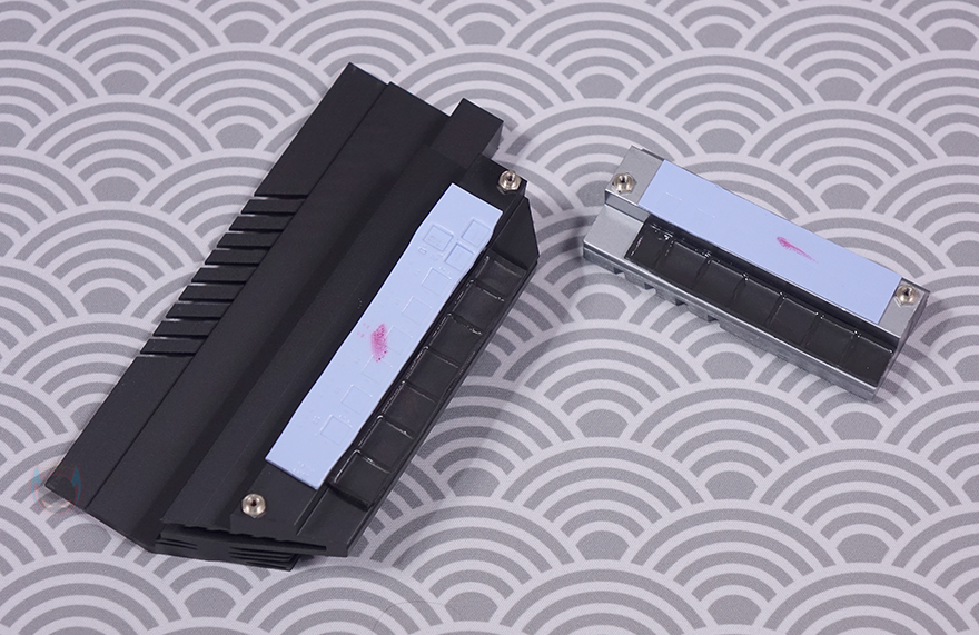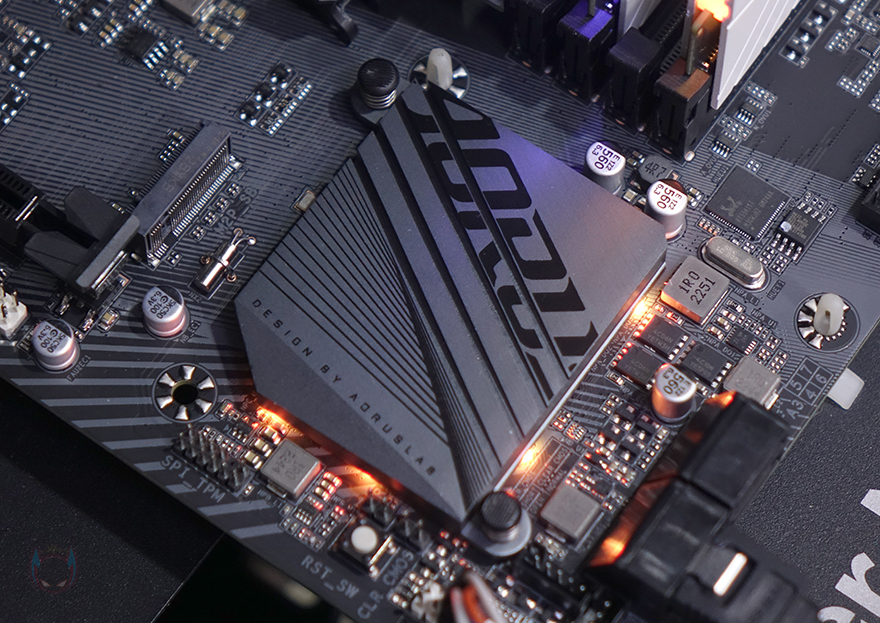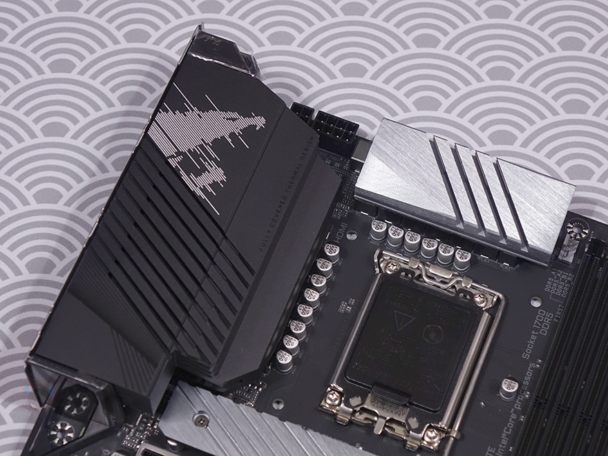 전원부에 장착된 방열판들을 분리해 보면 모스펫과 초크에 발열 해결을 위해 써멀패드를 부착해 놨으며, 전원부는 12+1+1 페이즈 구성에 디지털 전원부로 모스펫과 컨트롤러칩셋은 모두 Onsemi사 칩셋을 사용했습니다. 참고로, 모스펫 개당 최대 전력공급은 60A이며, 전원부 주변에는 ATX 보조전원 8핀과 4핀, 그리고 PWM 팬 커넥터가 배치된 것을 확인할 수 있습니다.