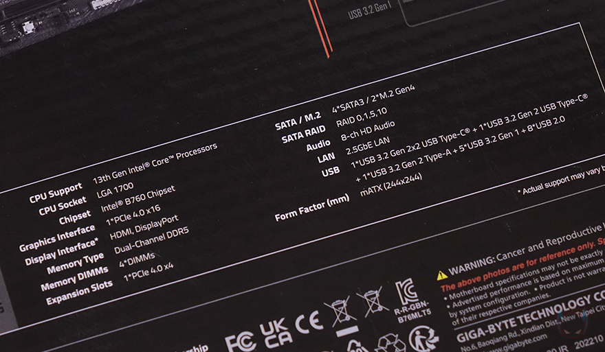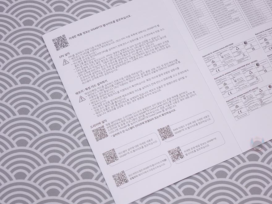 박스 후면에는 제품 풀-샷 이미지와 함께 좀 더 상세하게 제품 특징을 담고 있는데, 전원부 모스펫 전체를 덮는 큼지막한 방열판과 M.2 SSD 슬롯의 방열판, 12+1+1 페이즈 구성의 전원부, USB 3.2 Gen 2x2 Type-C 포트, 2.5GbE 랜 포트를 언급합니다. 그리고, 아래에는 백패널 I/O 포트 구성 표시와 바로 왼쪽에 제품의 기본 사양을 표기해 놨죠. 박스를 열어보면, 메인보드는 다른 메인보드 제품들처럼 정전기방지 포장재에 포장되어 있으며, 제품 구성은 B760M 어로스 엘리트, 제품안내서, SATA 케이블 2개 구성으로 간단한데, 제품안내서를 보면 QR코드로 기가바이트 홈페이지를 통한 제품설명서 안내 내용을 담고 있습니다. 최근에 전자제품 회사들이 환경을 생각해서 종이 낭비를 줄이는데, 기가바이트 역시 이런 취지라고 볼 수 있죠.
