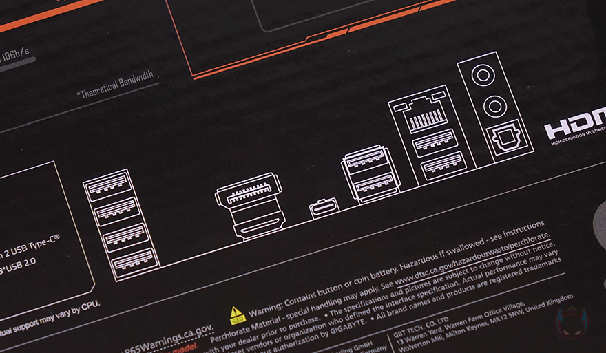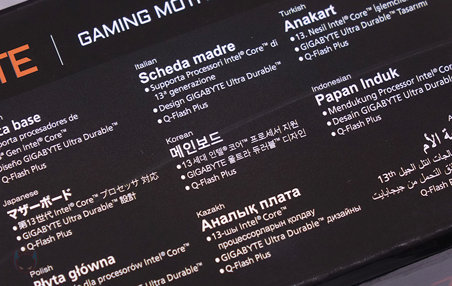 제품박스부터 살펴보면, 박스 전면에는 AORUS 라인업 제품답게 큼지막한 로고 이미지와 함께 제품명, 그리고 국내 인텔과 기가바이트 공식수입사인 (주)피씨디렉트의 3년 무상보증 스티커를 확인할 수 있으며, 최신 프로세서와 칩셋 표시도 확인할 수 있습니다. 박스 한쪽 측면에는 한국어를 포함해 각 나라별 언어로 간략하게 제품 특징을 표기해놨습니다.