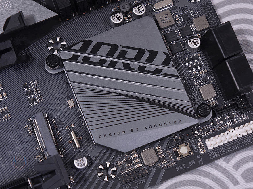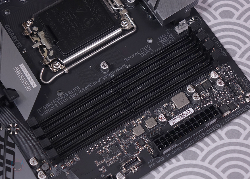 그럼, 본격적으로 기가바이트 B760M 어로스 엘리트(Aorus Elite) 메인보드 레이아웃을 살펴보는데, 폼 팩터 규격은 마이크-ATX(Micro-ATX)이며, 전반적으로 블랙색상 계열 디자인에 포인트로 일부 방열판 색상을 실버 색상으로 적용하고 있습니다. 좀 더 자세히 살펴보면, CPU 소켓은 12/13세대 CPU 지원에 맞춰 LGA1700이며, 소켓 주변 전원부에는 발열 해결을 위해 큼지막한 방열판과 작은 방열판이 장착되어 있는데, 큼지막한 방열판은 백패널 방향까지 모두 가리는 크기로 방열판에는 어로스 로고를 새겨놨습니다.