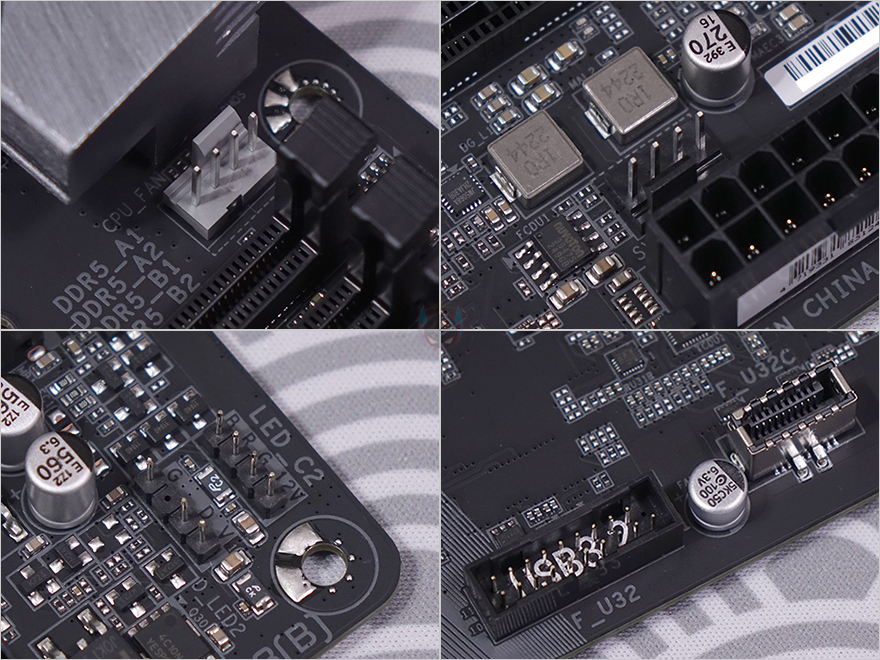 메모리 슬롯은 총 4개 슬롯은 DDR5를 지원하며, 최대 192GB 용량과 7600MHz이상 클럭을 지원합니다. 물론, B760 칩셋 메인보드이기 때문에 장착하는 CPU에 따른 메모리클럭 한계가 존재합니다. 그리고, 슬롯 주변에는 2개의 PWM 팬 커넥터와 기가바이트 RGB Sync와 연동할 수 있게 5V ARGB와 12V RGB 헤더가 배치되어 있으며, PC케이스 패널에 USB 포트와 연결되는 USB 3.2 내부 헤더와 USB 3.2 Gen 2 Type-C 포트도 배치된 것을 확인할 수 있습니다.