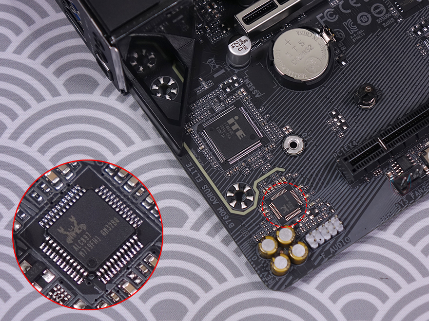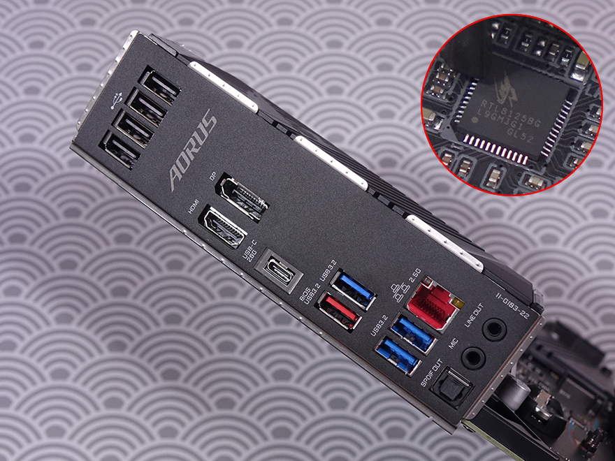 PCIe 슬롯 기준 오른쪽에는 B760 메인칩셋이 위치한 부분으로 역시 발열해결을 위해 방열판이 장착되어 있으며, 방열판을 분리하면 뒤에서 확인하겠지만, RGB 라이트효과를 볼 수 있게 LED가 4개 적용된 것을 확인할 수 있습니다. 그리고, 방열판 안쪽에는 써멀패드가 부착되어 있죠. 그리고, 맨 오른쪽에는 S-ATA 커넥터 4개가 배치되어 있습니다. 반대로 PCIe 슬롯 기준 맨 왼쪽에는 내장오디오 부분으로 독립 PCB 구간으로 처리했으며, 오디오 칩셋은 리얼텍사 칩셋이 적용되었습니다. 끝으로, 백패널 I/O 포트 같은 경우 알루미늄 실드가 기본 장착되어 있으며, 포트 구성에는 USB 2.0/1.1 포트 4개, 모니터 출력에 DP와 HDMI 포트, USB 3.2 Gen 2x2 Type-C 포트, USB 3.2 Type-A 포트 4개, 2.5GbE 랜포트, 오디오와 S/PDIF 커넥터가 배치되어 있습니다. 참고로, USB 3.2 Type-A 포트 중 빨간색 포트는 바이오스 업데이트할 때 전용으로 사용됩니다. 그리고, 랜 칩셋 역시 리얼텍사 칩셋이 사용되었습니다.