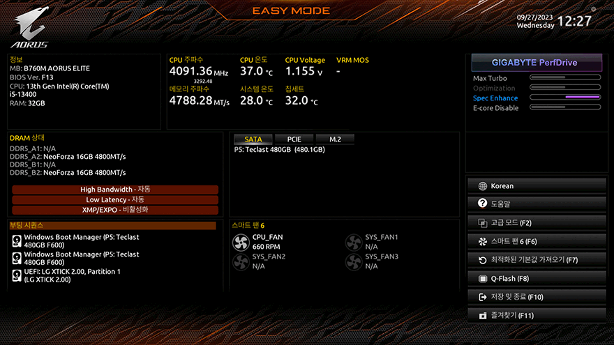 직접, 기가바이트 B760M 어로스 엘리트(Aorus Elite) 메인보드를 사용해 보면, B760 칩셋 특성상 CPU 오버클럭은 지원하지 않기 때문에 인텔 13세대 i5-134000 CPU를 장착했습니다. 물론, K시리즈 CPU도 사용은 가능합니다. 그리고, 메인보드에 전원이 들어오면 앞서 언급했듯이 메인칩셋 방열판 아래 주위로 RGB LED가 점등되는 것을 확인할 수 있죠. B760M 어로스 엘리트 메인보드의 바이오스 CMOS 메뉴를 잠깐 살펴보면, F2키를 통해 Easy 모드와 Advanced 모드로 전환할 수 있습니다. Easy Mode에선 CPU, RAM, 저장장치, 팬 등 한눈에 시스템 전체의 상태를 모니터링할 수 있으며, Advanced 모드로 전환하며 '즐겨찾기/Tweaker/Settings/System Info/Boot/저장및종료' 크게 5가지 메뉴로 분류되어서 사용자가 시스템 설정을 상세하게 다룰 수 있습니다.