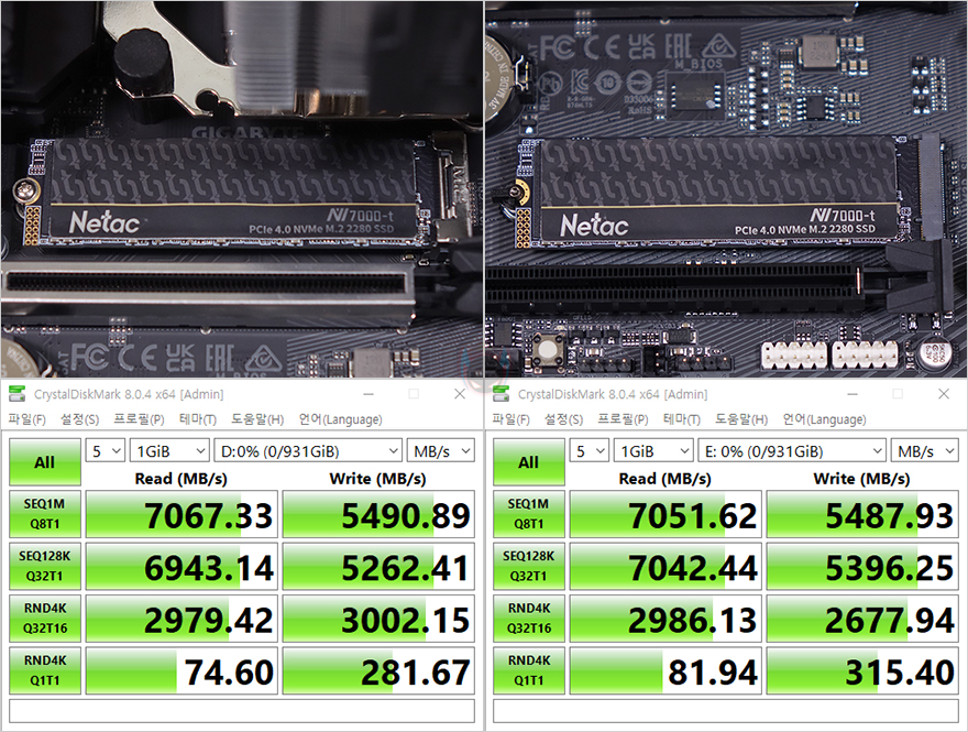 끝으로, B760M 어로스 엘리트 메인보드에 적용된 2개의 M.2 SSD 슬롯의 성능을 확인해 보면, 앞서 언급했듯이 규격은 PCIe 4.0 규격으로 최대 PCIe 4.0x4 레인을 지원하기 때문에 이를 지원하는 NVMe SSD를 장착해서 CrystalDiskMark로 속도측정을 해 본 결과, PCIe 4.0x4 규격에서 나올 수 있는 7000MB/s 속도를 그대로 보여줬습니다.