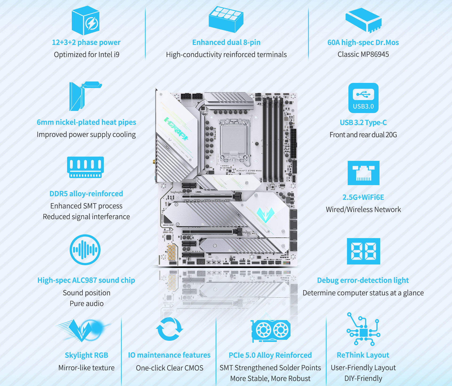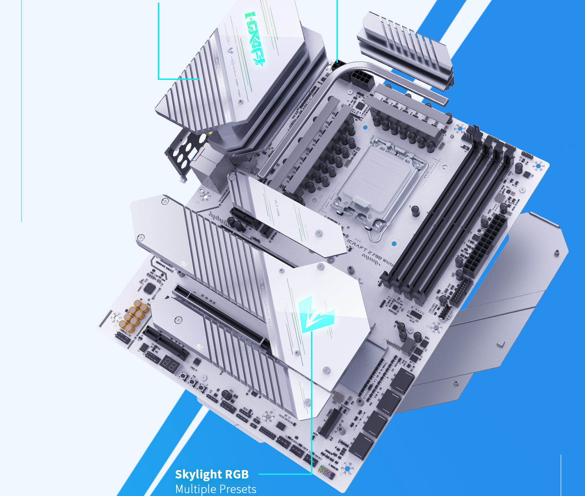 iCraft Z790 White 메인보드는 PCB기판까지 화이트색상으로 적용한 모델로 전원부의 방열판은 히트파이프를 함께 적용했으며, M.2 SSD 슬롯부분에도 모두 방열판이 적용되었다. 또한, 전원부와 메인칩셋 방열판에는 자사 RGB Sync인 Skylight RGB 라이트효과를 볼 수 있게 LED를 적용해놨으며, 메인보드 후면에는 백플레이트도 적용되어 있다.