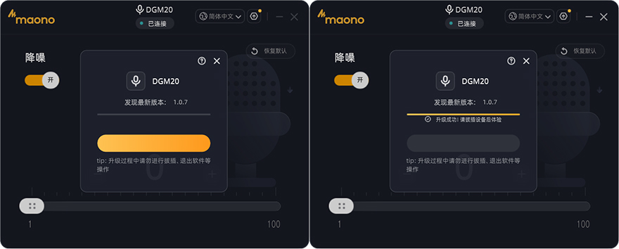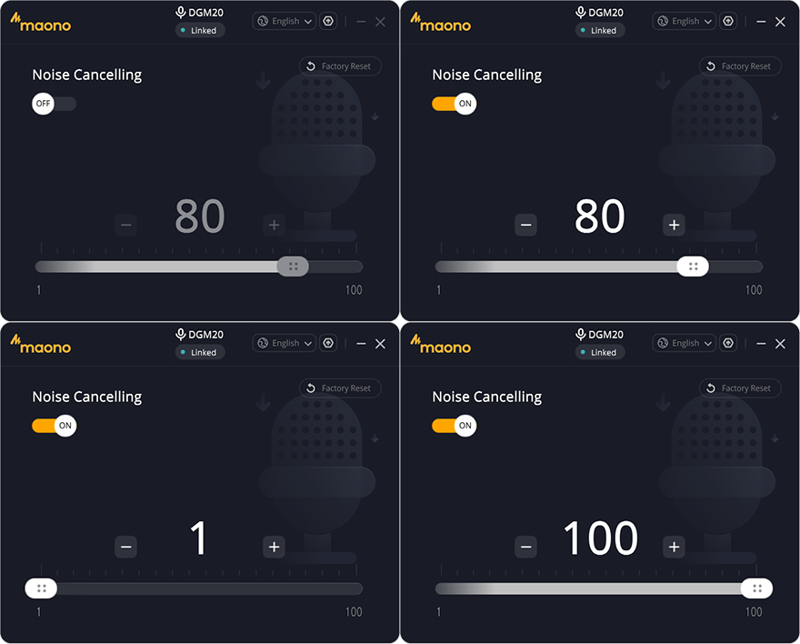 또한, 노트북/PC에서 사용할 때는 노이즈캔슬링-툴(Noise Cancellation Tool)을 제공해주고 있는데, 마오노 홈페이지에서 다운로드하여 설치 후 실행하면 프로그램에서 자동으로 펌웨어 업데이트를 체크해서 업데이트도 알려주기 때문에, 업데이트가 있을 시 업데이트를 먼저 진행해 주면 됩니다. 업데이트는 진행이 완료된 후에, 다시 마이크를 연결해 주면 업데이트된 최신 버전으로 인식되면서 프로그램을 사용하면 되고, 프로그램은 간단하게 노이즈캔슬링 On/Off만 조절할 수 있지만, 앞서 마이크 자체의 단순 노이즈캔슬링 On/Off만 있는 게 아니라 노이즈캔슬링 단계를 100단계로 조절할 수 있게 해 줍니다. 쉽게 말해, 프로그램에서 좀 더 세밀한 노이즈캔슬링 조절을 할 수 있다는 거죠. 참고로, 노이즈캔슬링과 게인 조절은 별개라서 두 조합으로 사용자 환경에 최대한 주변 소음을 줄일 수 있습니다.