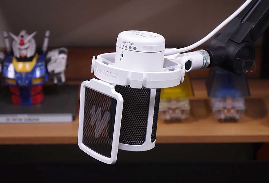 본격적으로 마오노(MAONO) DM20 USB 콘덴서 마이크를 살펴보면, 색상은 방금 제품박스 후면에서 확인했듯이 3가지 색상 블랙(Black)/화이트(White)/핑크(Pink)로 출시했으며, USB 전원케이블도 색상에 맞춰서 적용했습니다. 그리고, 앞서 언급했듯이 DM20도 DM30처럼 기본 스탠드를 제공해주고 있으며, 추가로 팝-필터(Pop-Filter)까지 제공해주고 있죠. 물론, 기본 스탠드를 제공해 주기 때문에 쇼크 마운트(Shock Mount) 장착도 기본으로 되어 있습니다. 그리고, 쇼크 마운트 전면에는 MAONO 로고(logo)도 새겨놨죠.