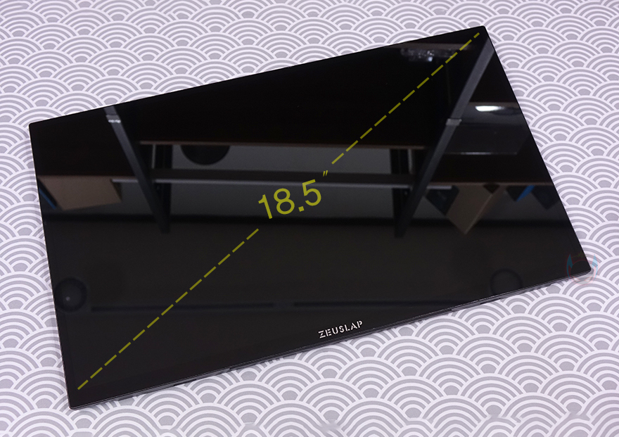 본격적으로 제우스랩(Zeuslap) Z18TV PRO 포터블 스마트모니터를 살펴보면, 시작에서도 잠깐 언급했듯이 화면크기는 18.5인치입니다. 먼저 출시했던 터치 포터블 모니터 Z18T과 동일한 크기이며, 외형적으로도 큰 변화는 없습니다. 뒤에서 다시 확인하겠지만, 해상도는 1920x1080 풀-HD를 가졌으며, IPS패널에 화면 베젤 아래 중앙에는 ZEUSLAP 로고(logo)를 표시해 놨죠. 모니터 후면에는 모니터암에 장착할 수 있게 75x75mm 베사홀도 갖추고 있습니다. 그리고, 바로 위에는 제품 모델명과 함께 최대 소비전력 30W 표기도 확인할 수 있죠.