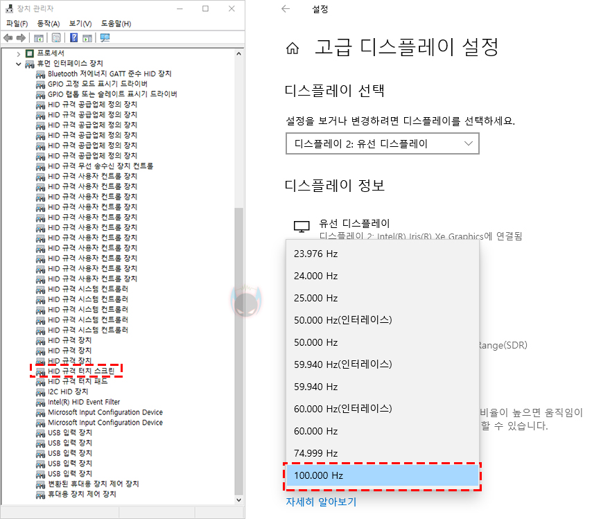 이번엔 Z18TV PRO 포터블 스마트모니터를 일반 모니터 역할 그러니깐 PC/노트북에 연결해서 사용해 보는데, PC/노트북 모니터로 사용할 때는 터치지원이 가능해지기 때문에, 터치 기능까지 사용하고 싶다면, 후면 오른쪽에 배치된 USB Type-C 포트 2개 모두 전원어댑터와 PC/노트북에 연결해줘야 합니다. 물론, 미니 HDMI도 기본적으로 사용해야겠죠. 3개 포트를 모두 연결하면, 제어판-장치관리자-휴먼 인터페이스에서 HID 터치 스크린이 활성화된 것을 확인할 수 있습니다. 그리고, PC/노트북 모니터로 사용할 시에는 최대주사율 100Hz까지 지원해 주며, 색재현율은 제품 스펙상으로 sRGB 100% 지원이라고 언급하고 있는데, 실제 측정한 결과값도 98.9%로 오차범위 내에 포함됩니다. 물론, IPS패널이라 178˚의 광시야각을 가지고 있으며, 터치포인트도 최대 10포인트이죠.