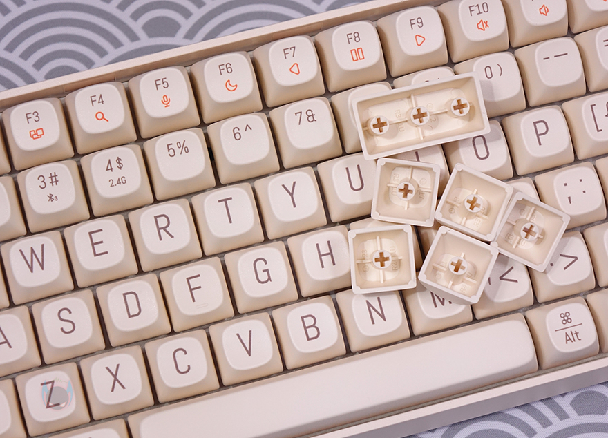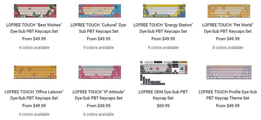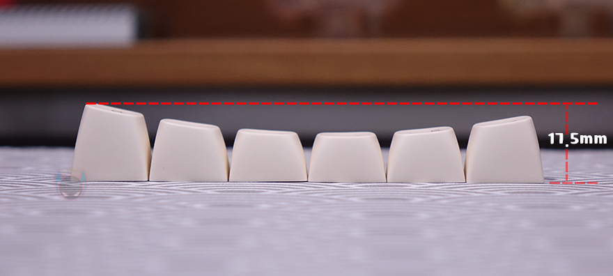 Lofree TOUCH 기계식 키보드의 키캡(Keycaps)은 PBT 재질이며, 뒤에서 확인하겠지만, LED 백라이트는 없기때문에 이중사출 방식은 아니죠. 하지만, Tofu와 Gray 키보드 색상에 맞춰서 기본 키캡들 색상 역시 통일시켰으며, 앞서 기본사양 표기에서 확인했듯이 운영체제(OS) 지원은 윈도우(Windows)뿐만 아니라 맥(Mac), 안드로이드(Android)에서도 사용이 가능하기 때문에, 키캡 자판 인쇄 일부에는 윈도우와 맥 OS 기능을 동시에 해놨습니다. 그리고, Tofu 색상경우 오렌지색상에 가까운 교체용 포인트 키캡 하나를 추가로 제공해주고 있는데, ESC키 라인에 키캡과 교체할 수 있죠. 또한, 측면에서 전체 키캡 높이를 보면 17.5mm로 가장 높은 SA 프로파일보다 더 높은데, 앞서 키보드 측면에서 본 곡선라인이 키캡에서 나오는 거라는 걸 알 수 있습니다. 물론, 이런 곡선과 경사도까지 신경 쓴 이유는 오랜 타이핑시 손가락의 피로도를 줄이기 위함이라고 보면 됩니다. 또한, 시작에서 언급했듯이 현재 Lofree의 대표 키보드 모델이 TOUCH 기계식 키보드이기 때문에 다양한 디자인의 키캡 상품들을 출시하고 있는데, 지금까지 40가지 이상의 디자인을 출시했으며, 앞으로도 계속 늘어날 예정이기 때문에 키캡 상품만으로 자신 취향만의 TOUCH 기계식 키보드 분위기를 연출할 수 있겠습니다.