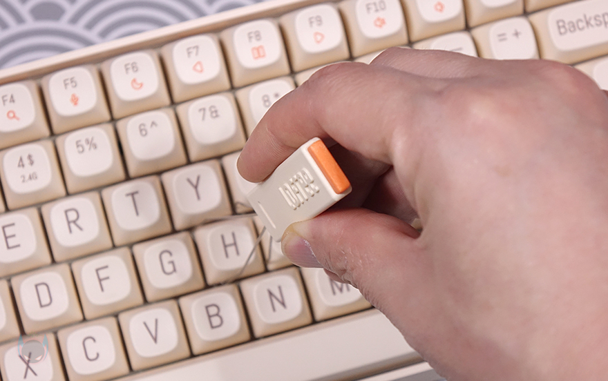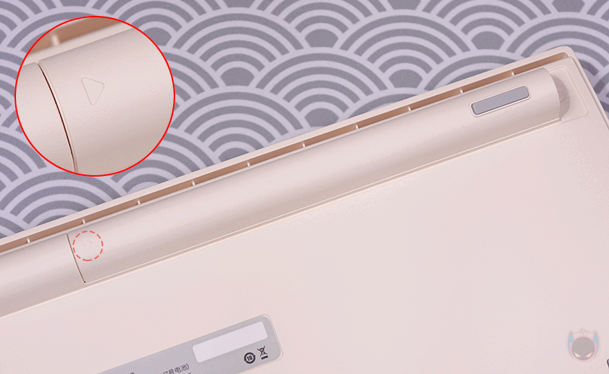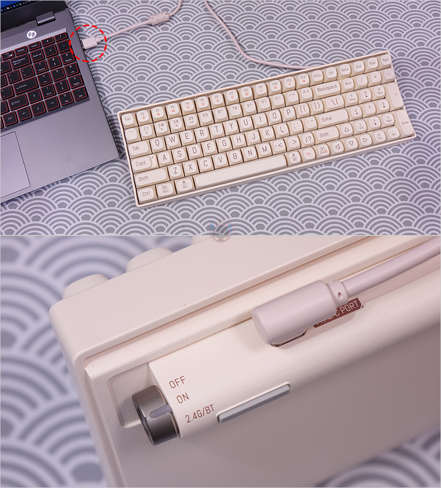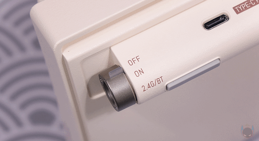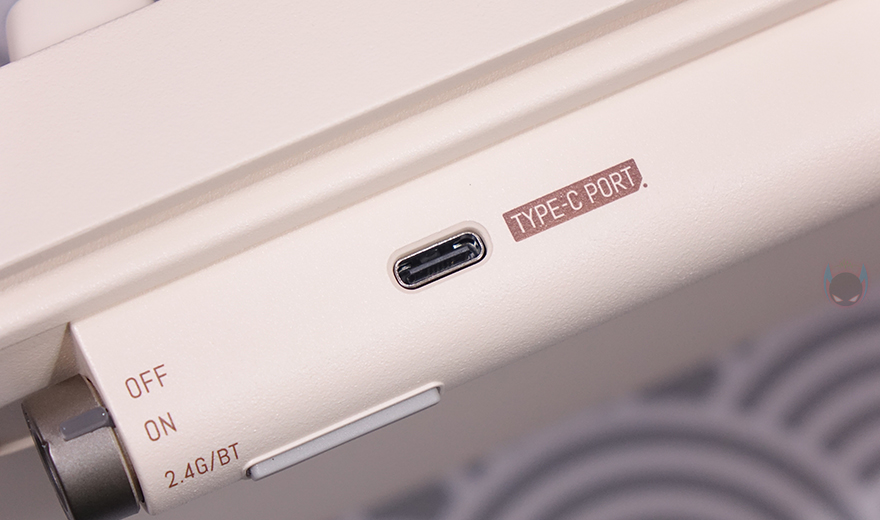 완전 측면 상태에서보면 9˚ 곡선 라인 높이가 자연스러울 정도로 곡선의 미가 더 잘 느껴지고, 앞부분에 높낮이 받침 역할이 되는 밑바닥 오른쪽 측면에는 원형 디자인의 스위치 방식으로 Off, On, 2.4G/BT 3가지 모드를 선택할 수 있게 해 주는데, Off는 전원 Off를 의미하며, On은 전원 켜짐과 동시에 유선 모드, 나머지 2.4G/BT는 무선 모드로 뒤에서 확인하겠지만, 다른 무선 키보드처럼 Fn키 조합으로 디바이스 선택으로 연결됩니다. 또한, 원형 디자인의 가운데 부분은 유선과 무선 연결 시 작동상태 확인으로 화이트색상 LED로 점등되었다 꺼집니다. 그리고, 같은 위치에 전면 방향에는 유선시 사용되는 USB 전원케이블과 연결되는 USB Type-C 포트가 배치되어 있죠.