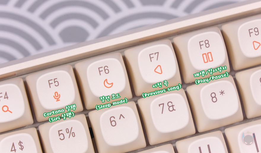 TOUCH 기계식 키보드 역시 Fn키 조합으로 부가기능들을 지원해주고 있으며, 앞서 모드 스위치로 통해 유선, 무선 2.4G, 블루투스 3가지 연결방식 지원한다고 했는데, 블루투스와 무선 2.4G 모드는 스위치로 모드를 선택한 후 Fn+1/2/3/4 숫자키 조합으로 연결할 수 있게 갖추고 있습니다. 이밖에 바로 위에 F숫자 키들 역시 F1~F2는 화면밝기조절, F3은 창 간 전환, F4는 검색, F5는 윈도우 운영체제에서 Cortana 실행, F6은 절전 모드, F7~F9는 재생컨트롤(Media play), F10은 음소거, F11~F12키 조합으로는 볼륨조절 기능을 갖추고 있죠. 참고로, Fn키 바로 오른쪽에 있는 Ctrl키 조합으로는 마우스 오른쪽 버튼을 클릭하면 나오는 메뉴(Menu)를 실행합니다. 끝으로, 유선 모드시 사용되는 USB 전원케이블은 약 1.5m 길이에 USB Type-A to C 인터페이스를 가졌는데, 키보드와 연결되는 Type-C는 90˚ 각도로 연결이 편하도록 했으며, 신호손실 최소화를 위해 노이즈-필터(Noise filter)와 인터페이스에 금도금(USB gold plated) 처리를 해놨습니다.