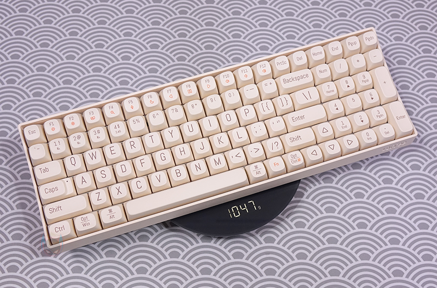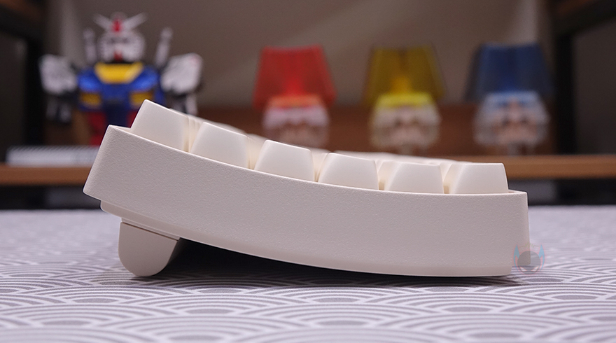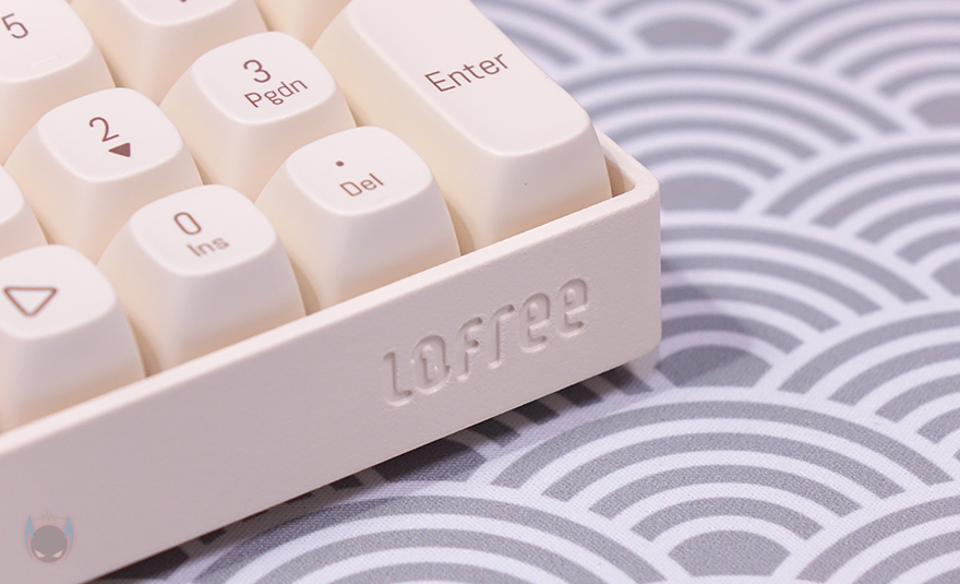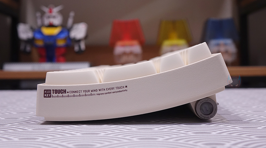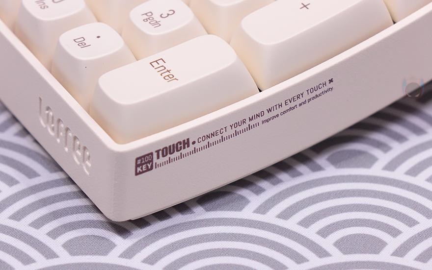 리뷰에선 Tofu 색상의 100키 배열 모델로 살펴보는데, 요즘 트렌드 중 하나인 96~100 키 배열에 맞춰 TOUCH 역시 전형적인 100 키 배열을 갖추고 있습니다. 숫자 키패드와 방향키 외에 일부 특수키를 갖추면서도 크기는 104~108 키 배열보다 작은 것이 100 키 배열의 특징이죠. 건전지를 수납하지 않은 상태의 키보드는 무게는 약 1kg이며, TOUCH 키보드의 가장 큰 특징은 측면에서 확인할 수 있는데, 바로 9˚의 곡선 라인으로 만들어진 높이입니다. 타이핑 효율성은 높이면서, 미적인 감각까지 살린 디자인이죠. 마치 타자기를 모티브 한 느낌이 들면서도 타자기 같지는 않은데, 전체적인 키보드 색상과 조합되어 클래식한 감성을 자아냅니다. 또한, 오른쪽 측면에는 콘셉트 문구로 포인트를 주고 있으며, 그대로 아래로 이어지는 맨 오른쪽 구석에는 음각으로 Lofree 로고(logo)를 새겨놨습니다.