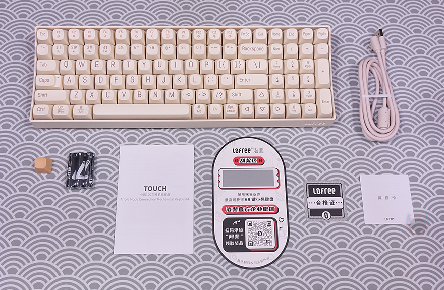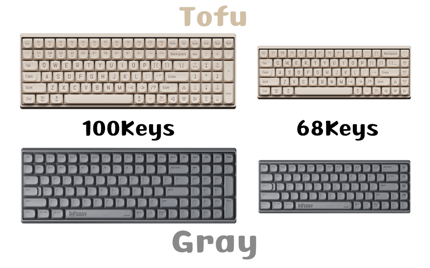 본격적으로 Lofree TOUCH 기계식 키보드를 살펴보는데, 일단 색상은 아이보리(Ivory) 계열의 Tofu와 그레이(Gray) 2가지 색상으로 나왔으며, 앞서 겉표지 표기에서 100 키 배열을 잠깐 확인했지만, TOUCH는 100 키(keys) 외에 68 키 배열도 있습니다. 물론, 지난 시간에 먼저 만났던 TOUCH PBT 무선 마우스와 세트로 맞추고 싶다면, Tofu 색상을 선택하는 게 좋죠.