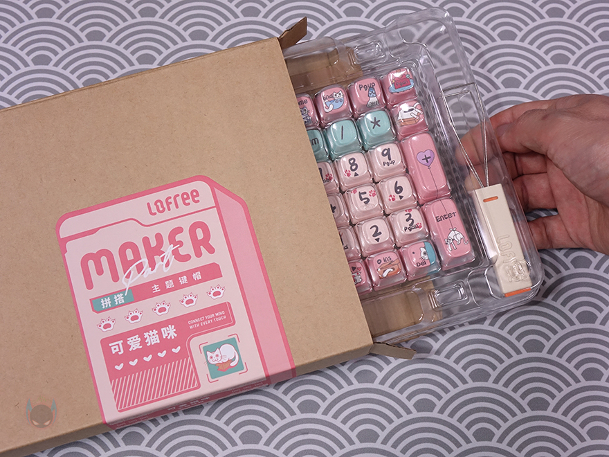 실제로 여러 키캡(keycpas) 상품들 중 인기 상품 중 하나인 Dear Kitty 키캡 상품을 살펴보면, 박스 포장에 박스 전체까지 밀봉처리가 되어있으며, 박스를 뜯지 않고 외부에서 키캡 디자인 일부를 볼 수 있게 공개되어 있습니다. 박스를 열어서, 키캡은 흔들리거나 분실되지 않게 각 키 크기에 맞춘 캡-방식으로 포장되어 있으며, 키캡 교체에 필요한 키-풀러(Key puller)도 기본 제공해주고 있으며, 안내카드와 품질보증서도 구성품에서 확인할 수 있죠. 실제로 기본 키캡 색상을 분리하고, Dear Kitty 키캡으로 교체해보면, 또 다른 분위기 연출이 느껴지기 때문에 앞서 언급했듯이 자신만의 취향으로 키캡을 선택해 보는 것도 좋을 것 같습니다.