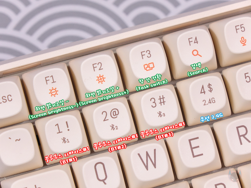 직접, Lofree TOUCH 기계식 키보드를 사용해보면, 기기와의 연결방식은 앞서 언급했듯이 유선, 무선 2.4G, 블루투스(Bluetooth) 3가지 방식으로 지원하는데, 유선은 모드 스위치를 On으로 선택한 후, USB 전원케이블을 연결하면 별도의 드라이버 설치 없이 플러그 앤 플레이(Plug&Play) 방식으로 인식되어 바로 사용하면 됩니다. 그리고, 무선 2.4G 역시 앞서 확인한 리시버(Receiver)를 PC/노트북에 연결한 후, 모드 스위치는 2.4G/BT로 선택한 후 Fn+숫자키 4(Num 4) 조합으로 누르고 있으면 연결이 됩니다. 끝으로, 블루투스 같은 경우에도 PC/노트북 혹은 태블릿/스마트폰 같은 모바일기기에서 블루투스 기능을 켜놓고, 모드 스위치를 역시 2.4G/BT로 선택한 후, Fn+숫자키 1/2/3(Num 1/2/3) 3개 중 하나를 선택해서 1초 이상 누르고 있으면, Capslock 키 오른쪽에 화이트 LED가 깜빡이면서 페어링 모드가 활성화되는데, 이때 연결할 기기에서 장치검색을 통해 'Touch100@Lofree'라고 검색되면 선택해서 연결하면 됩니다.