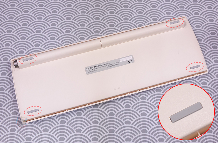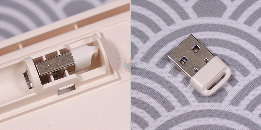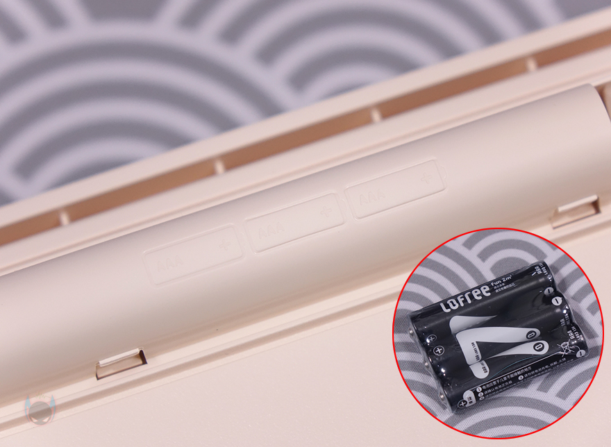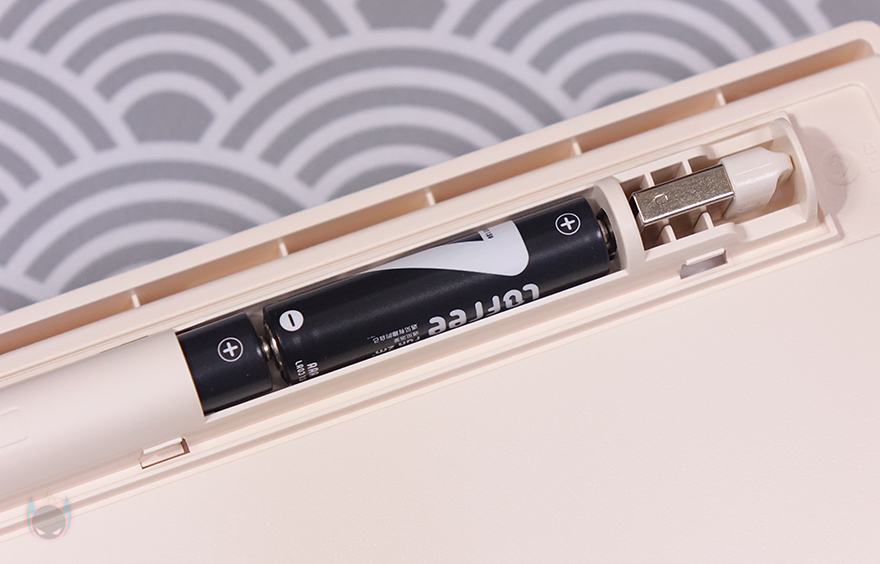 키보드 밑바닥에는 모서리 부근으로 미끄럼방지 및 진동소음 최소화를 위해 패드가 부착되어 있으며, 전면 기준 앞부분 높낮이 받침의 왼쪽부분에는 무선시 사용되는 건전지가 들어가는 공간으로, 표시된 화살표(▷) 방향으로 멀어서 커버를 열면 건전지 수납공간이 확인할 수 있습니다. 또한, 맨 왼쪽에 무선 2.4G 사용 시 이용되는 수신기(receiver)가 수납된 것을 확인할 수 있으며, 건전지 수납공간에는 +/-로 건전지 수납 방향을 표기해 놨으며, 건전지는 앞서 구성품에서 확인했듯이 AAA 건전지 3개가 들어가며, 기본 제공해주고 있고, 최대 사용시간은 30일입니다.