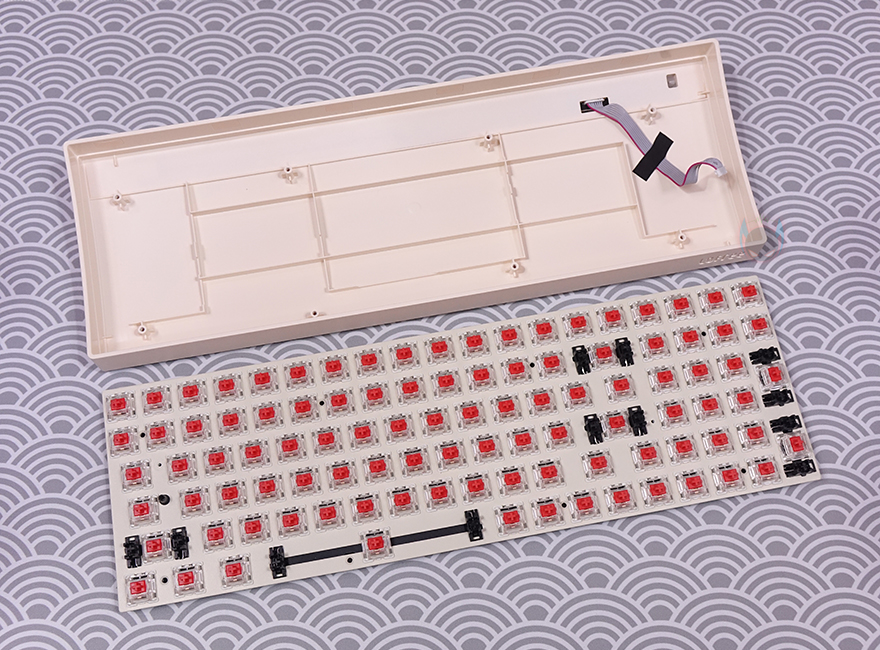 그리고, 키캡을 모두 분리하면 스틸(Steel) 재질의 보강판에 위아래 총 8개의 나사가 체결되어 있는데, 나사를 풀면 쉽게 보강판과 키보드 하판 케이스를 분리할 수 있습니다. 방금 스위치부분에서 확인했듯이 LED가 없기때문에 구조는 단순하며, 보강판과 PCB 사이에는 실리콘(Silicone)재질의 흡음재(Pad)가 적용된 것을 확인할 수 있습니다. 만약, 기본 흡음재만으로도 소음해결이 부족하다면, 하단 케이스 공간에 사용자가가 언제든지 추가로 흡음재를 넣을 수 있겠습니다.