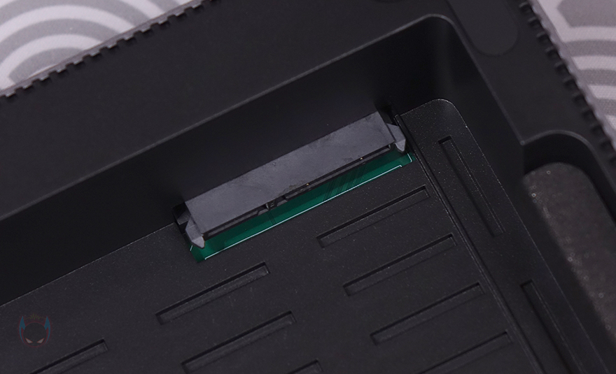 상판을 열고 내부를 살펴보면, CD3510 외장 케이스는 3.5인치 HDD가 장착되기 때문에 3.5인치 크기에 맞춘 수납공간을 가지고 있으며, 연결 방식은 SATA 방식이며, 규격은 6 Gbps입니다. 그리고, 수납공간 양쪽과 SATA 연결 반대쪽에는 HDD가 수납되면 움직이지 않도록 스펀지 패드와 고정대(Lock) 장치가 배치되어 있죠. HDD 장착은 고정대가 있는 부분에 밀착해서 넣은 후, SATA 연결부 쪽으로 밀어서 장착하면 손쉽게 마무리가 되고, 고정대를 돌려서 움직이지 않도록 해주면 됩니다.
