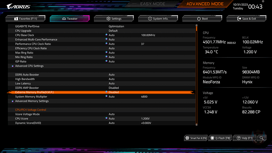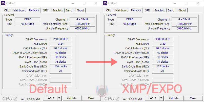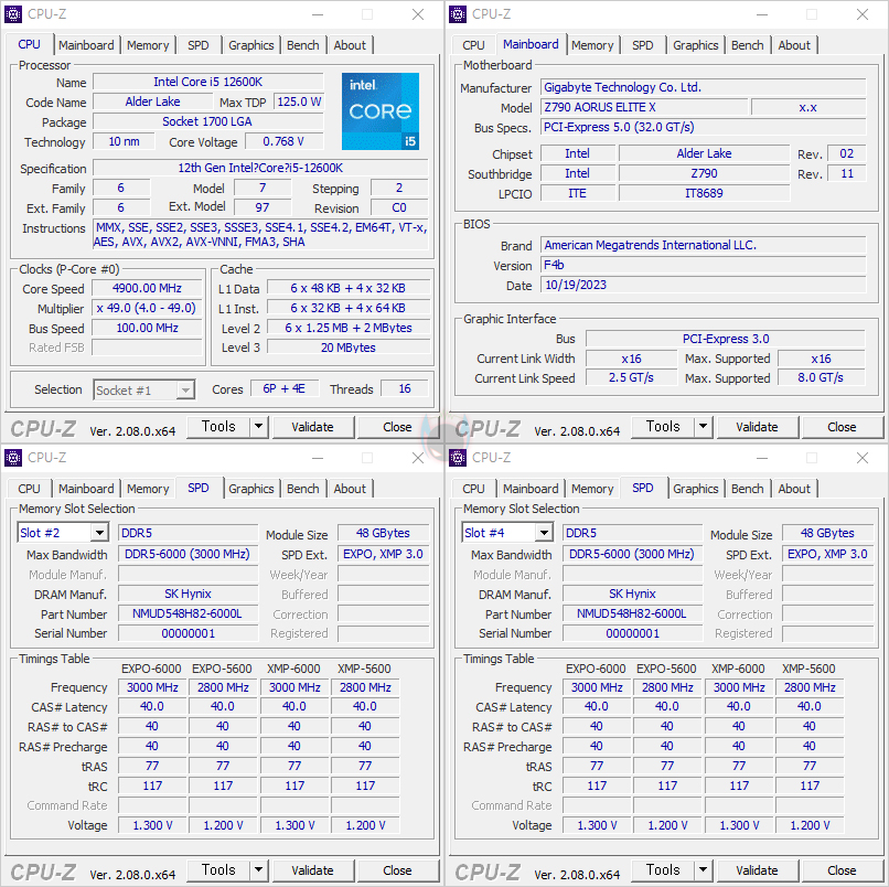 직접, Neo Forza(네오포르자) MDK5 DDR5 6000MHz 96GB Kit 메모리를 사용해 보는데, 일단 인텔(Intel)/AMD 모두 DDR5 지원을 시작하면서 현재까지 DDR5의 단점으로 지적되는 부분이 있습니다. 바로, 풀뱅크 또는 대용량일수록 성능 저하가 발생한다는 거죠. 정확한 원인을 밝혀지지 않았지만, 메모리컨트롤러의 한계로 추측하고 있으며, 64GB 이상부터 발생하는 것으로 알려지고 있습니다. MDK5 DDR5 6000MHz 96GB Kit 역시 총 메모리 용량이 96GB으로 대용량에 속하기 때문에 기존의 32GB(16GBx2), 64GB(32GBx2) 용량보다 성능이 낮을 수 있습니다. 이 부분을 참고해서 MDK5 DDR5 6000MHz 96GB Kit의 성능을 확인해 보도록 하겠습니다. 그전에 일단, MDK5 DDR5 6000MHz 96GB Kit의 메모리 모듈은 SK Hynix가 사용되었는데, 참고로 24GB, 48GB 모듈에선 요즘 인기를 받고 있는 M Die, A Die 모듈이 없습니다. 그리고, MDK5 DDR5 6000MHz 96GB Kit 역시 인텔(Intel) XMP 3.0과 AMD EXPO 프로파일이 적용된 모델이라 소비자가 손쉽게 메인보드 CMOS에서 XMP/EXPO 프로파일을 불러서 손쉽게 오버클럭 적용할 수 있는데, MDK5 DDR5 6000MHz 96GB Kit는 5600MHz과 6000MHz 2가지로 저장되어 있으며, 리뷰에선 모델명대로 6000MHz으로 적용했습니다. 참고로, XMP/EXPO 적용전 기본 작동클럭은 4800MHz입니다.