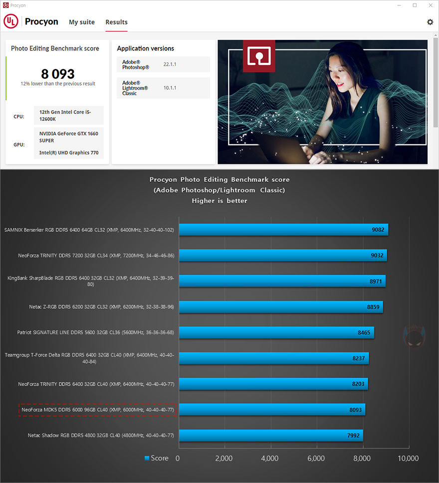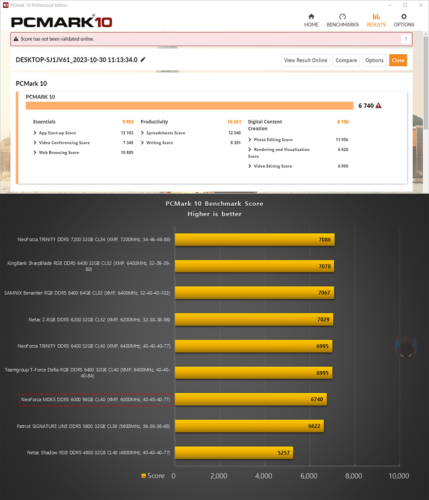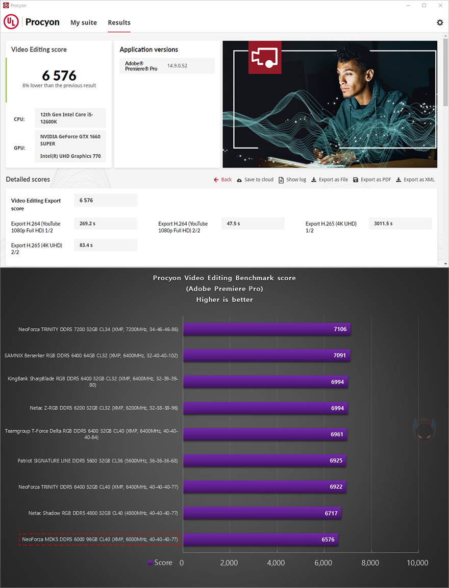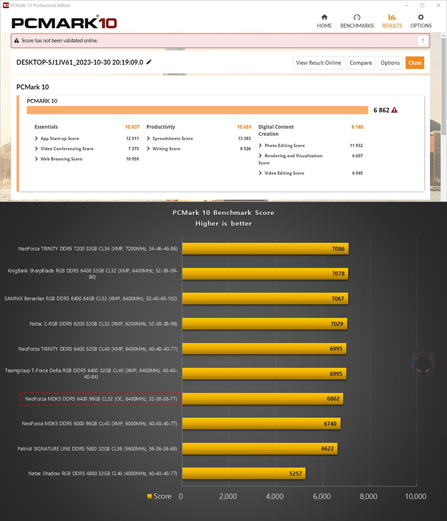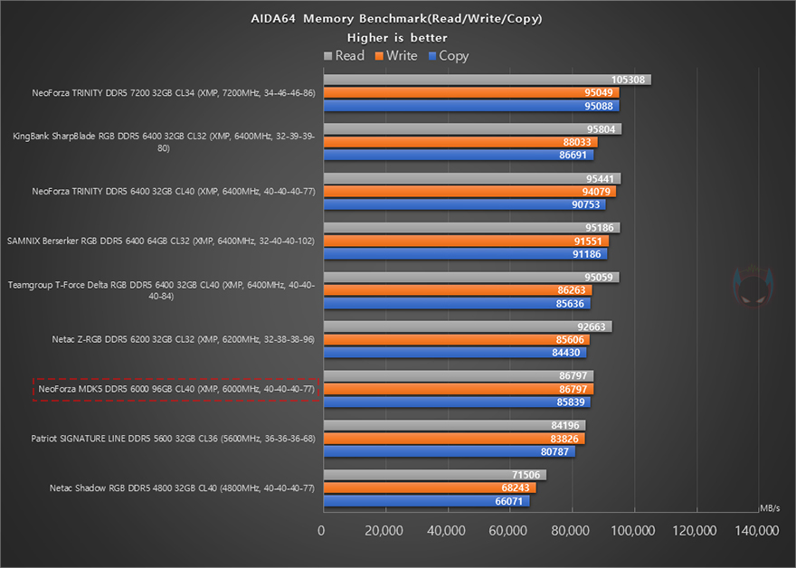 확인결과 AIDA64 Cache&Memory Benchmark에선 대역폭도 늘어났지만, 눈에 띄게 레이턴시가 줄어든 것을 확인할 수 있습니다. 물론, 96GB 용량보다 작은 32/64GB 비교 모델들보다는 느리지만, MDK5 DDR5 6000MHz 96GB Kit가 96GB 대용량이라는 점을 감안하면 앞서 XMP/EXPO 프로파일로 사용할 때보다 많이 빨라진 겁니다. 뿐만 아니라, Passmark PerformanceTest, UL Benchmark PCMARK 10, Procyon 벤치마크 모두에서도 6400MHz 32GB 비교 제품들에 근접하거나 앞서는 결과도 보여줬죠. 즉, 방금 언급했듯이 64GB 이상의 대용량으로 메모리 구성을 한다면 오버클럭과 램 타이밍은 필수라고 봐야 합니다. 물론, 성능에 중점을 두는 소비자라면 말이죠.