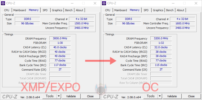 성능 확인 시작 전에 언급했듯이 MDK5 DDR5 6000MHz 96GB Kit 메모리는 6000MHz XMP/EXPO 프로파일을 가졌지만, 램 타이밍값은 기본값 수준에 불과합니다. 여기에 용량도 대용량이죠. 따라서, 성능을 더 올리고 싶다면 수동오버클럭은 필수입니다. 그래서, 이번엔 프로파일의 전압인 1.3V을 그대로 유지하고, 클럭은 6400MHz으로 올리고, 램 타이밍은 40-40-40-77보다 더 낮춰서 32-38-38-77로 적용해 벤치마크를 실행해 봤습니다.