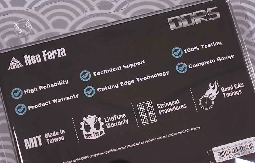 또한, 패키지 후면에는 간략하게 주요 특징을 표기해놨는데, 높은 신뢰성, 기술지원, 100% 테스트과정, 제품보증, 최첨단 기술, 폭넓은 호환성 등 주로 제품보다는 브랜드가 추구하는 특징을 표기해 놨습니다. 물론, 지금까지 Neo Forza를 여러 번 소개하면서 언급했지만, Goldkey는 대만 업체이기 때문에 메모리 제품들은 대만산(MIT)에서 생산되죠. 패키지를 열어보면, 다른 구성품은 없으며 MDK5 DDR5 6000MHz 96GB Kit 구성의 48GB DDR5 2개가 들어있습니다.