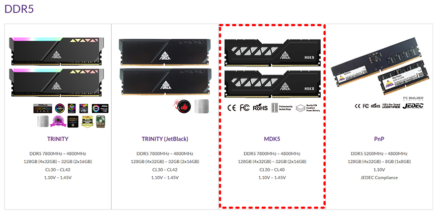 Neo Forza의 MDK5 DDR5 6000MHz 96GB Kit 메모리를 살펴보면, 일단 그전까지 피스커뮤를 통해 Neo Forza DDR5 메모리를 만나본 모델은 TRINITY(https://piscomu.com/4347, https://piscomu.com/4239) 였습니다. 게이밍 메모리라면 빠질 수 없는 RGB 라이트효과가 적용된 모델이 TRINITY가 유일하기 때문에 사실상 Neo Forza의 대표 모델이죠. 하지만, Neo Forza는 이외에도 Non-RGB TRINITY 모델인 JetBlack DDR5도 있으며, 아예 또 다른 디자인의 방열판이 적용된 Non-RGB의 DDR5 모델도 있는데, 그게 바로 MDK5입니다.