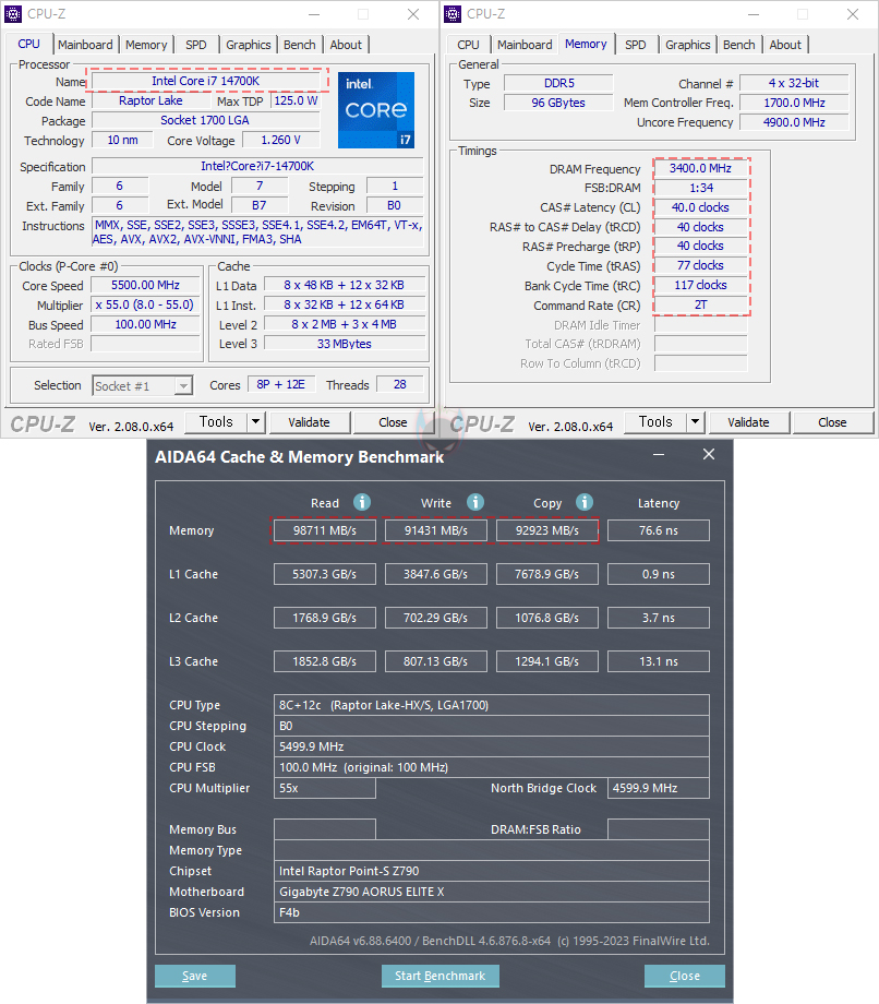 끝으로, 앞서 언급했듯이 현재 DDR5는 메모리컨트롤러 영향을 받기 때문에 인텔(Intel) 같은 경우에는 CPU 등급에 따라서 메모리 클럭 지원 차이도 있습니다. 실제로, MDK5 DDR5 6000MHz 96GB Kit를 이번에 출시한 인텔 14세대 i7-14700K로 바꿔서 메모리 오버클럭을 해보면, 6400MHz 다음으로 높은 6800MHz 클럭까지 적용되는 것을 확인할 수 있었다. 앞서 언급했듯이 MDK5 DDR5 6000MHz 96GB Kit가 SK Hynix 모듈을 사용했지만, 24/48GB 모듈에선 M-Die, A-Die가 없기때문에, 일반 모듈이라고 가정하면 평균 6800~7000MHz까지 오버클럭되는게 현재 상황이라 MDK5 DDR5 6000MHz 96GB Kit 역시 CPU 등급만 높다면, 충분히 최대 클럭까지 도달할 수 있습니다.