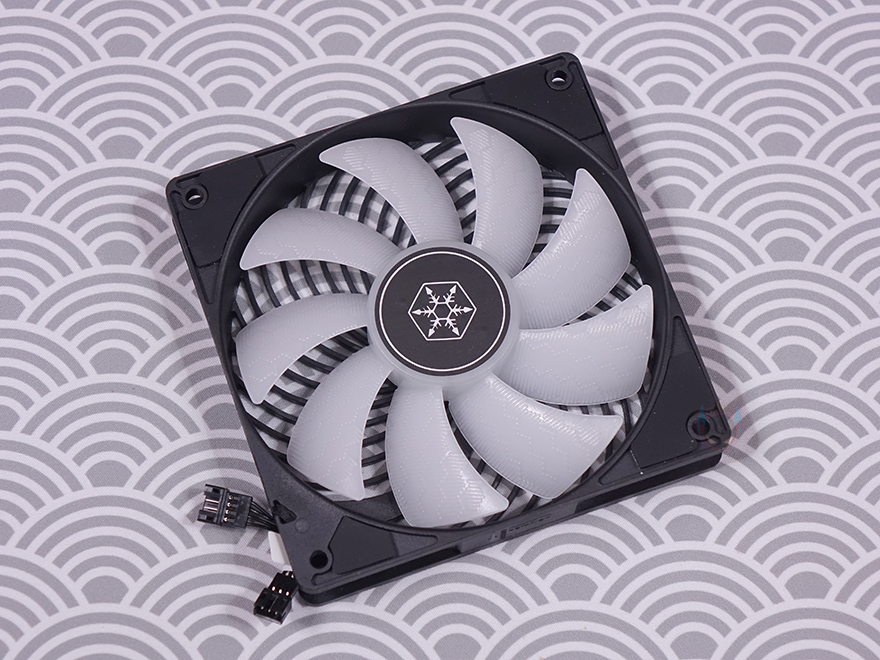그리고, 팬 모서리 부근에는 나사-홀 처리와 함께 주변에 진동소음을 줄이도록 방진패드를 기본 부착하고 있으며, 모서리 한쪽에는 실버스톤 Air Penetrator/Shark Force/Slimmer ARGB 팬에서 볼 수 있는 FAN 케이블과 ARGB 케이블이 연결되는 분리형 커넥터를 확인할 수 있습니다. 또한, 팬 후면에는 Air Penetrator의 특징인 에어 채널링(Air channeling) 그릴 디자인을 확인할 수 있죠. 이런 실버스톤의 에어 채널링 그릴 디자인은 이미 잘 알려진 대로 유입된 공기가 후면으로 빠질 때 분산되지 않고 집중되도록 해주며 더 멀리 전달되도록 해줍니다.