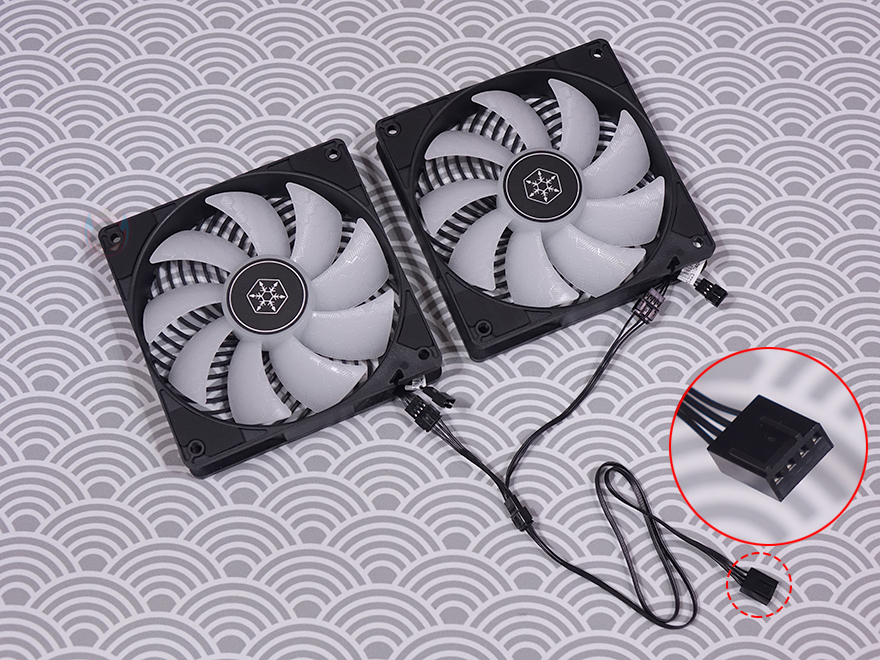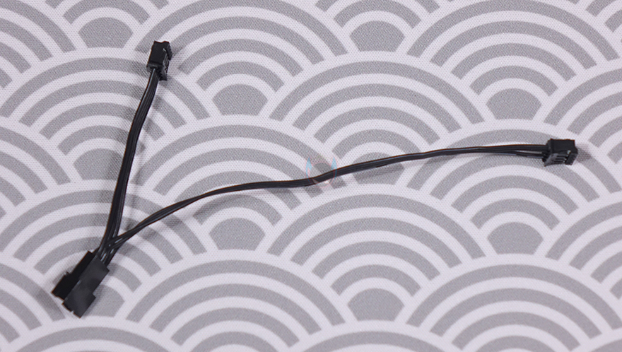 케이블은 팬 케이블(FAN Cable)과 ARGB 케이블 2가지가 제공되는데, 팬 케이블 같은 경우에는 자사의 다른 ARGB 팬들과 동일하게 기본 연결 케이블과 Y자 확장 케이블로 구성되어 있습니다. Y자 확장케이블로 팬을 서로 연결시키면서 확장하고 마지막에 기본 케이블로 메인보드에 연결하면 되는 거죠. ARGB 케이블 역시 동일한 방식으로 기본 헤더 케이블과 Y자 확장 케이블이 제공됩니다. 특히, 케이블 커넥터 부분에는 암/수(female/male) 연결어댑터를 함께 제공해주고 있어서 호환성 걱정이 없죠. 물론, 팬 커넥터 규격은 PWM(4Pin)이고, ARGB는 5V 규격입니다.