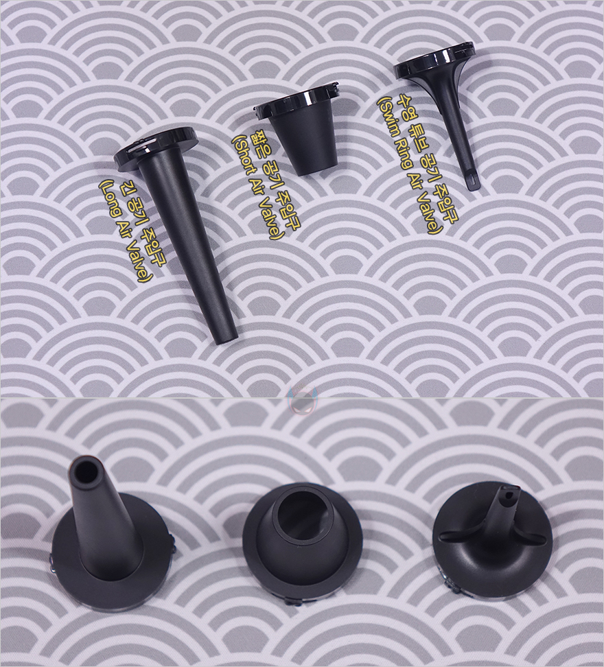 이번엔 배출구와 연결되는 커넥터들을 살펴보는데, 총 3개의 커넥터 제공으로 2개는 일반 주입구(Valve) 노즐로 긴 길이와 짧은 길이를 각각 가지고 있으며, 나머지 1개는 수영 튜브 같은 뽀족하고 납작한 노즐을 가졌습니다. 노즐 구멍을 비교해보면, 짧은 주입구가 가장 크고, 그다음 긴 주입구, 가장 작은 구멍은 수영 튜브 공기 주입구입니다. 물론, 명칭만 구분해놓은거라 실제 사용은 공기 주입구뿐만 아니라 에어브러시처럼도 사용할 수 있기때문에 사용자가 적절하게 판단해서 용도에 맞게 커넥터를 선택해서 사용하면 됩니다.